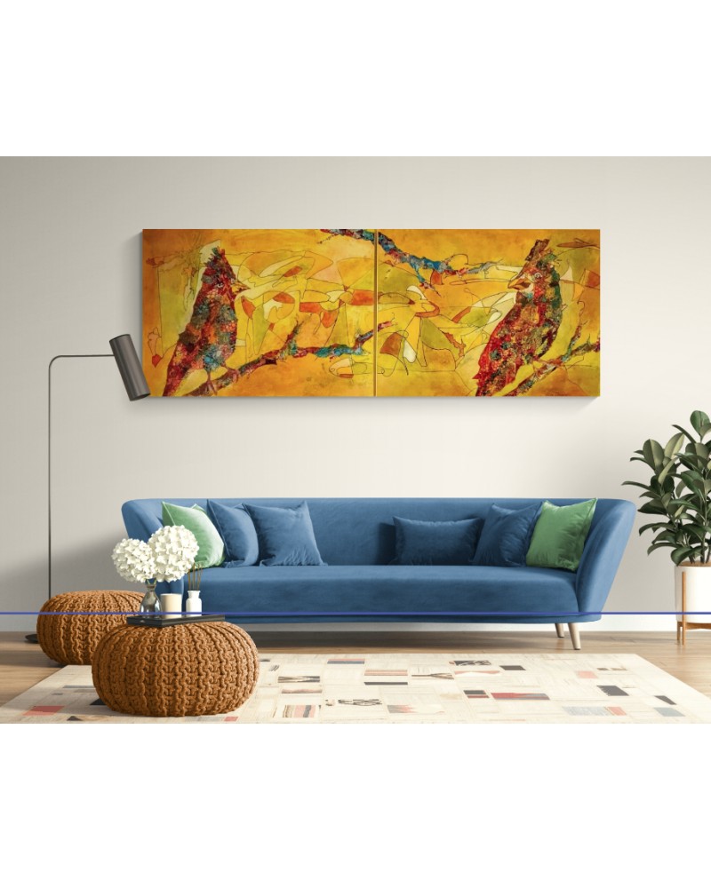 Technique à l'aide de pochoirs, impression de supports papier de plusieurs couches de peinture, découpage et collage des papiers imprimés sur toile.