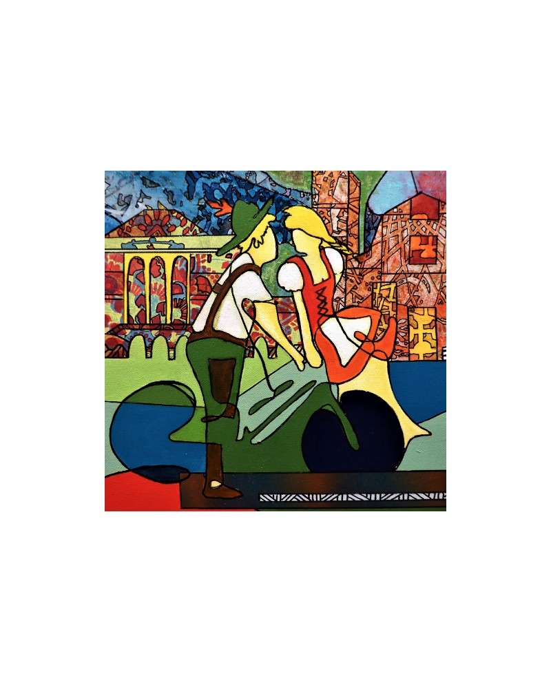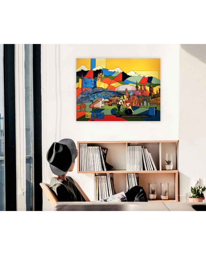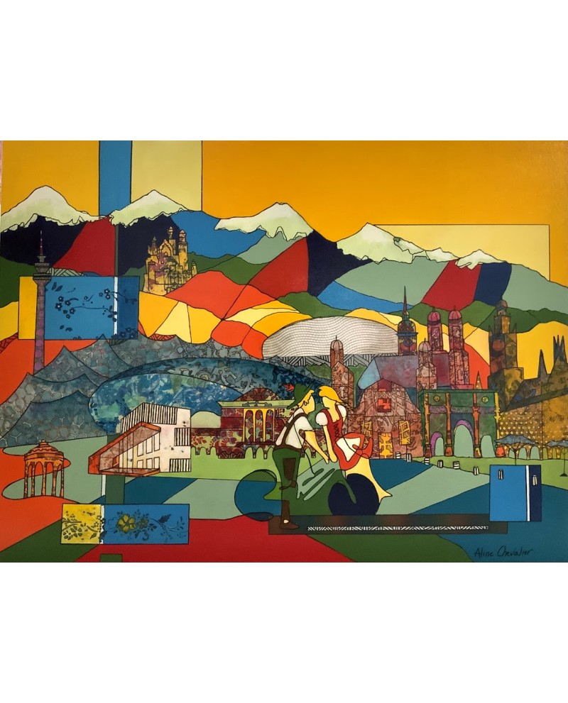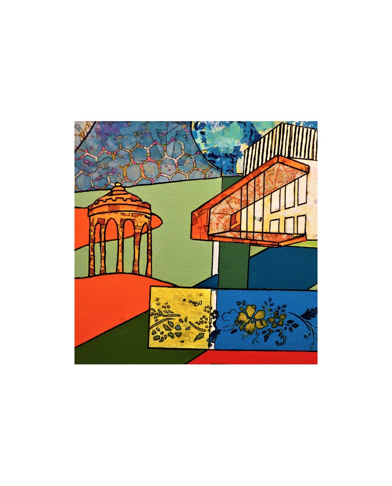 Technique à l'aide de pochoirs, impression de supports papier de plusieurs couches de peinture, découpage et collage des papiers imprimés sur toile.