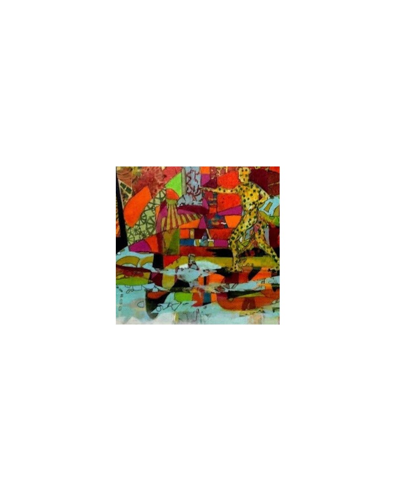 Technique à l'aide de pochoirs, impression de supports papier de plusieurs couches de peinture, découpage et collage des papiers imprimés sur toile.