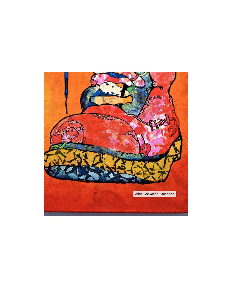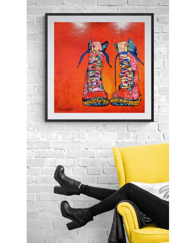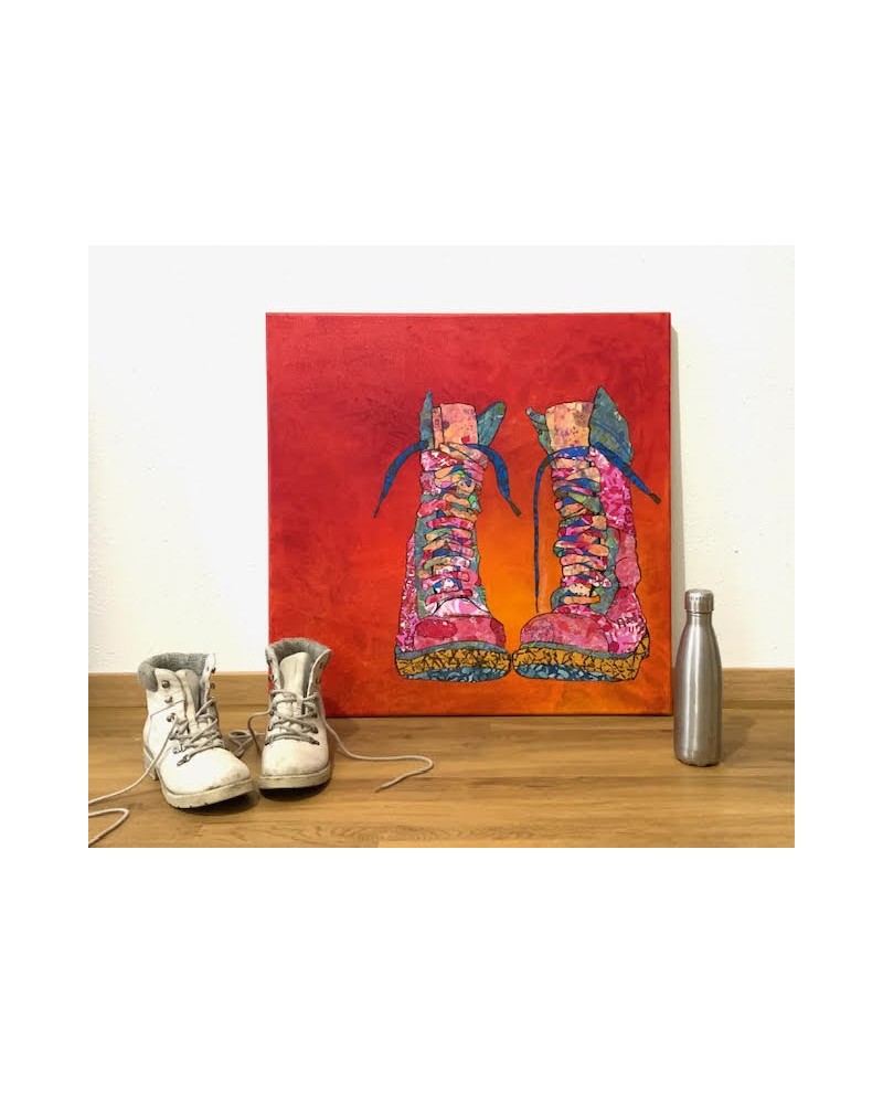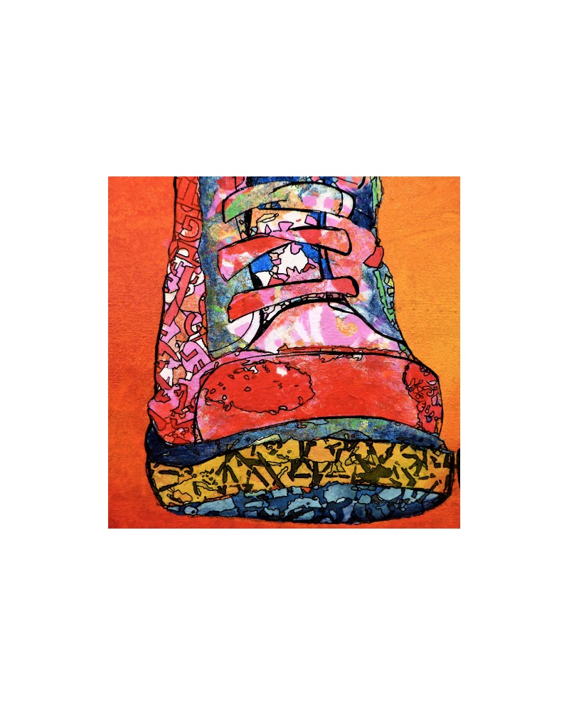 Une œuvre aux tonalités vives et chaleureuses, représentant une paire de chaussures.