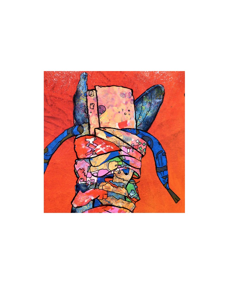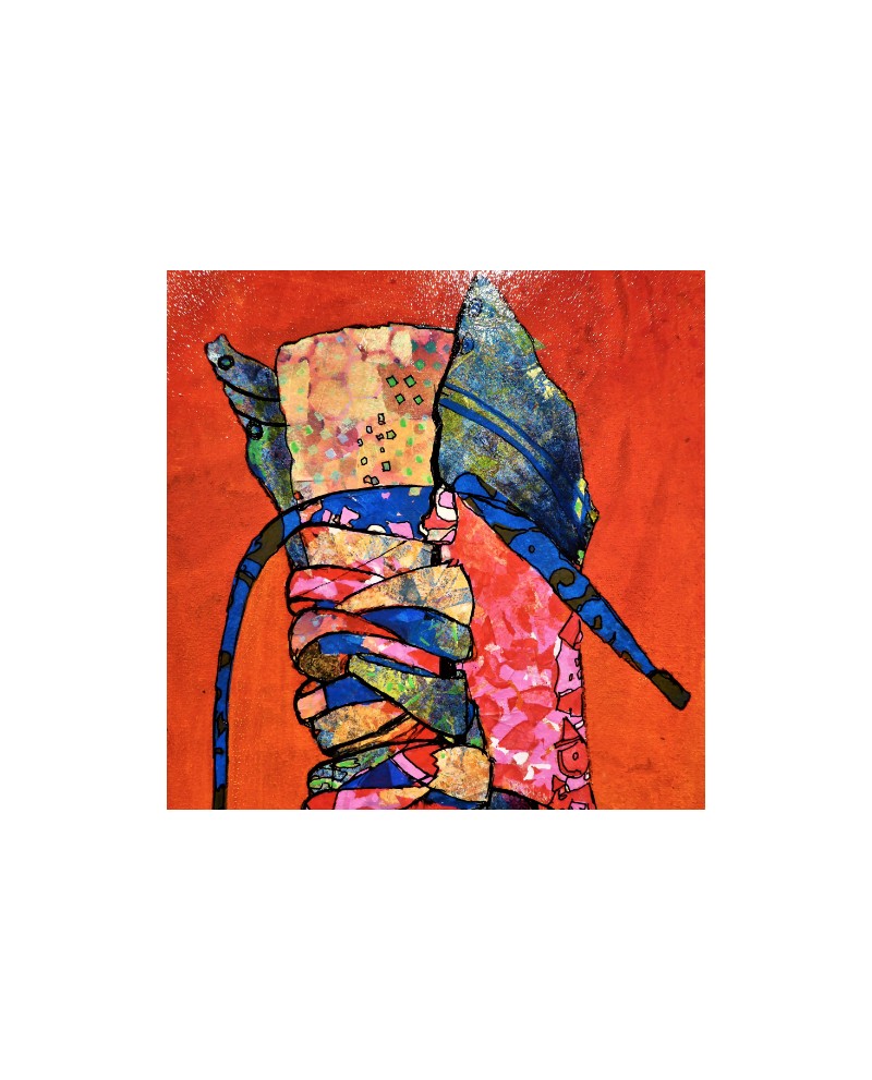 Un mélange subtil de peinture acrylique et de papiers collés sur la toile, signature de l'artiste.