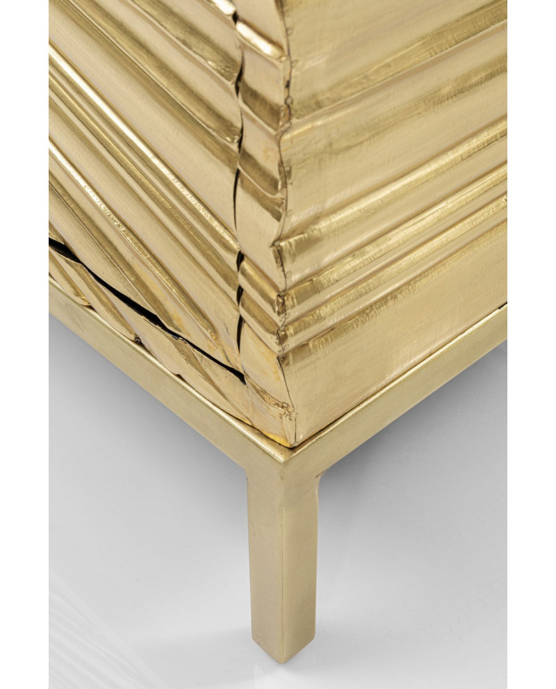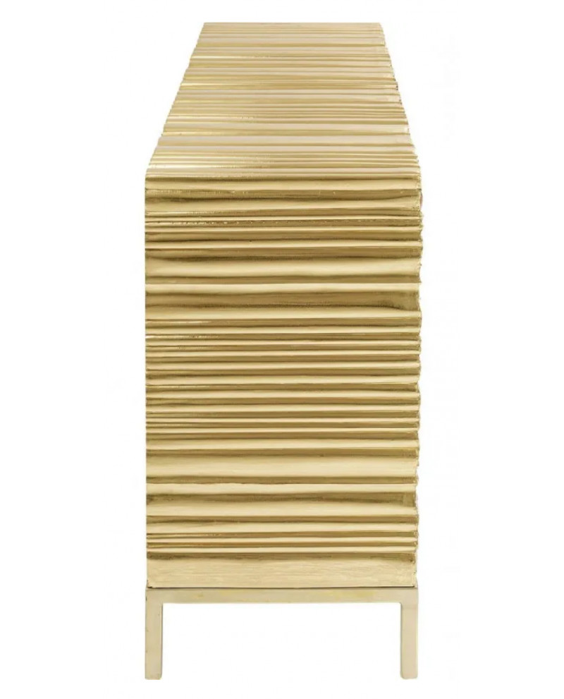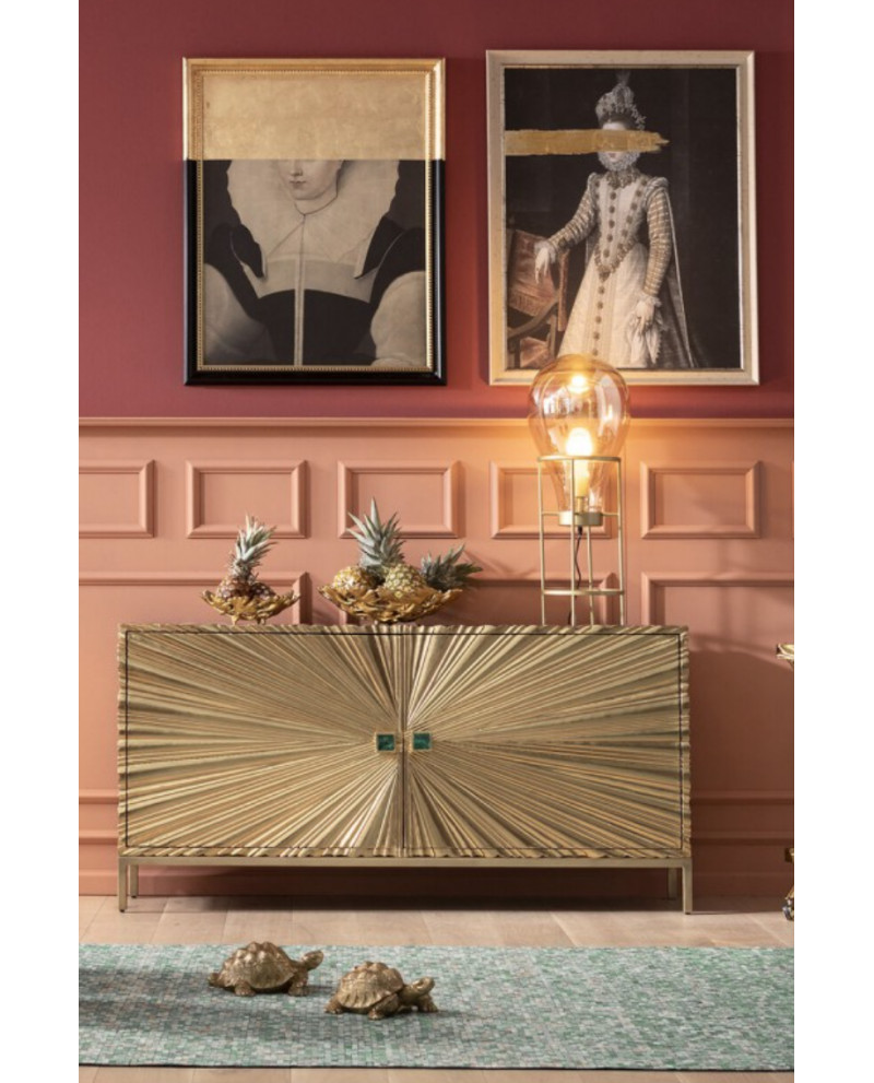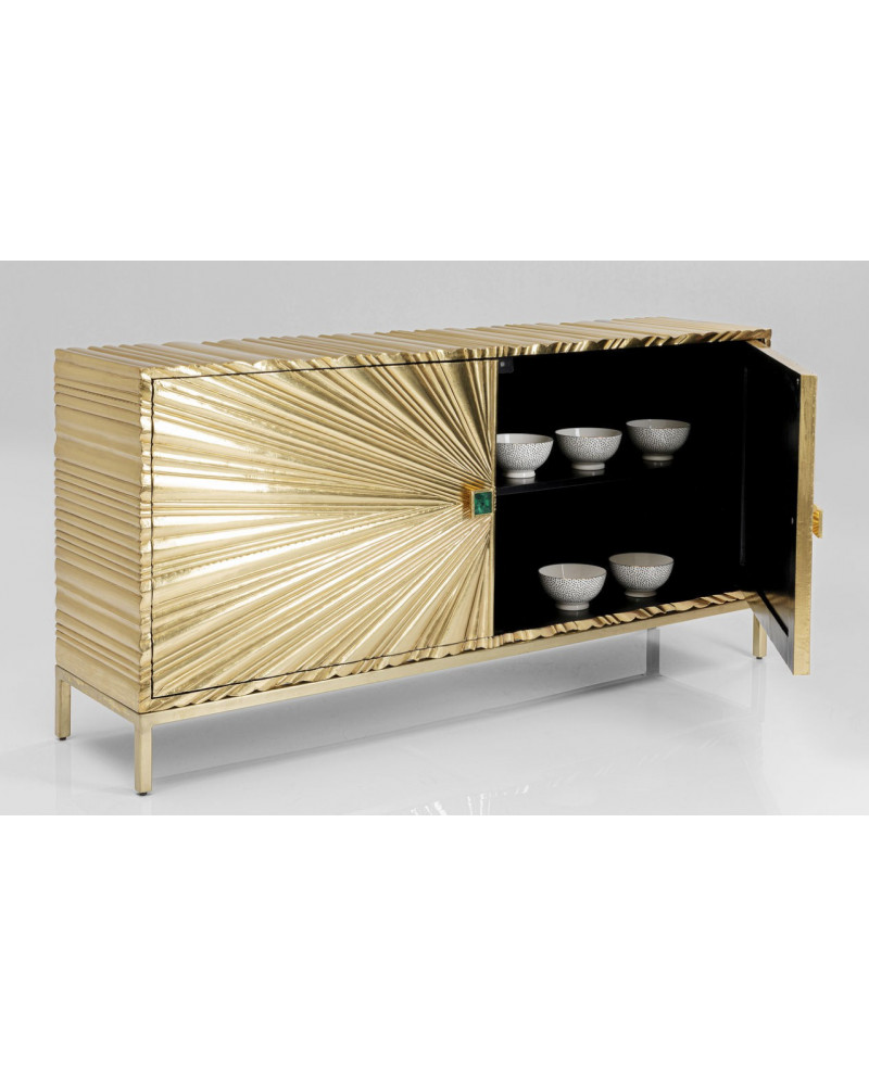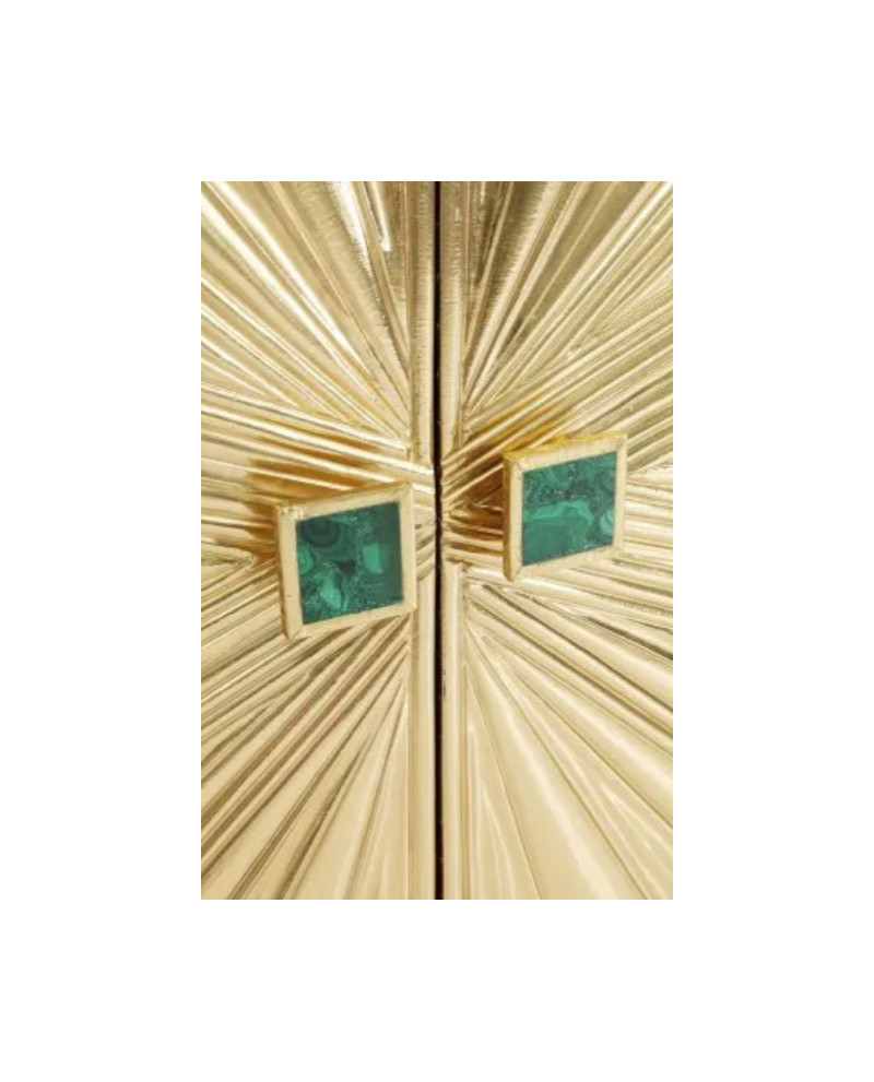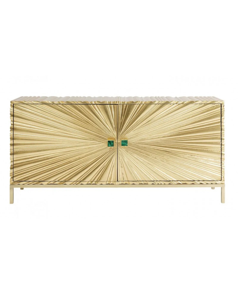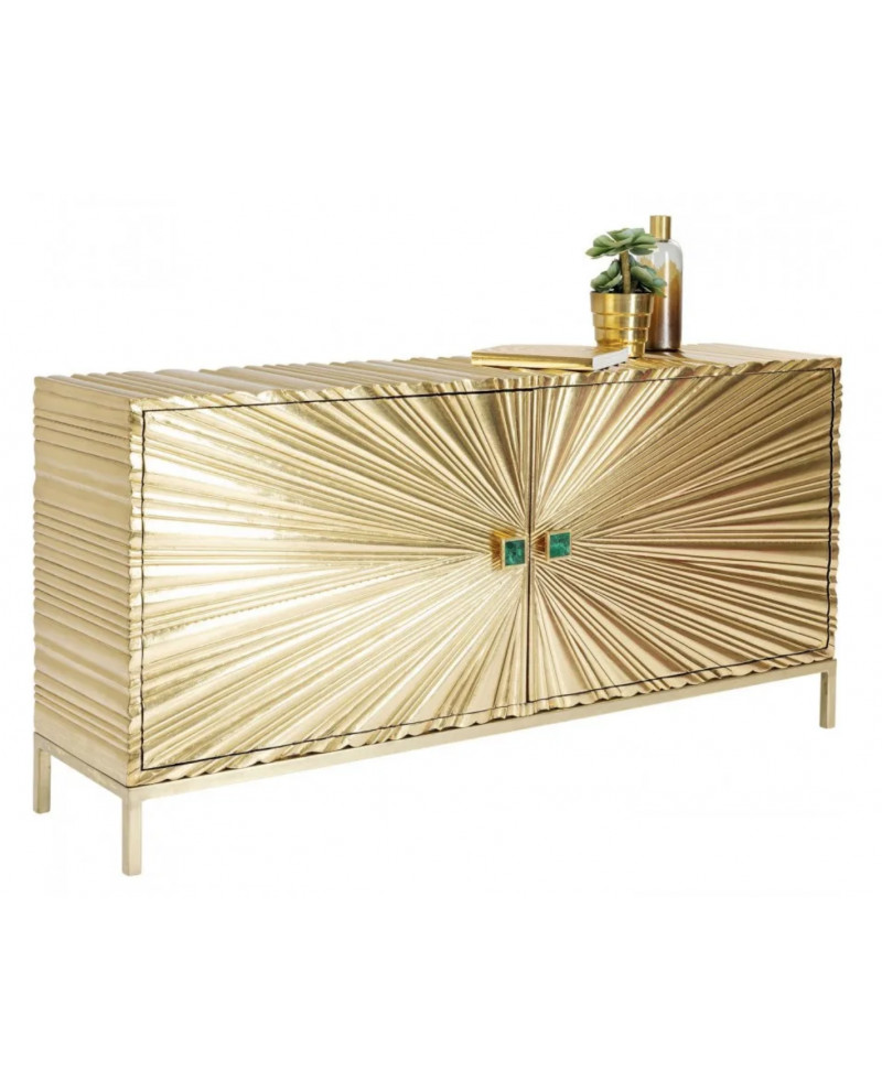 Optez pour ce buffet éblouissant doré doté d’un design hypnotique en rayons qui s’étendent sur toute la surface pour donner un effet de profondeur au meuble. Ses poignées vert émeraude aux allures de pierres précieuses complètent le tout avec élégance. Une pièce phare qui va attirer la convoitise de vos convives !
