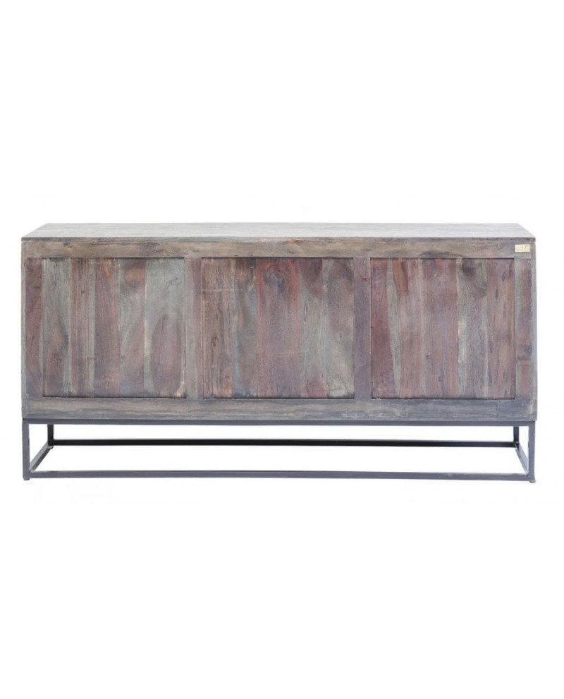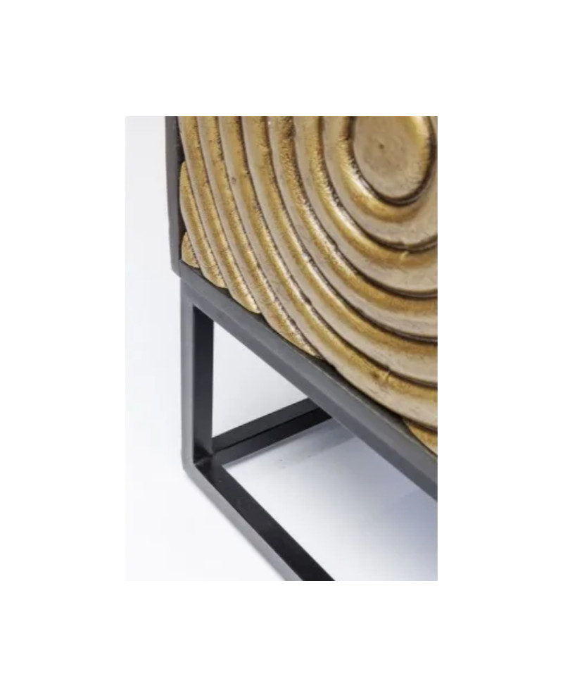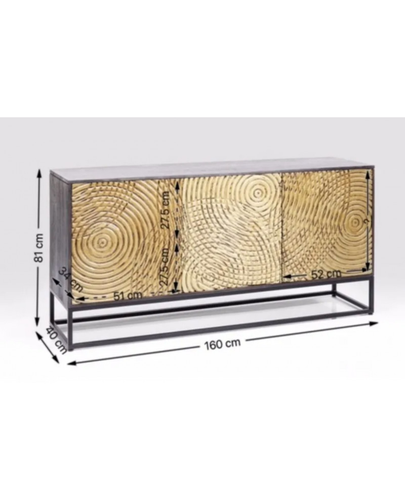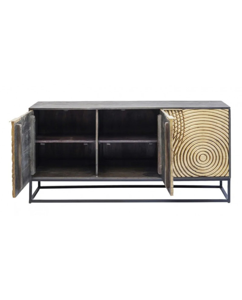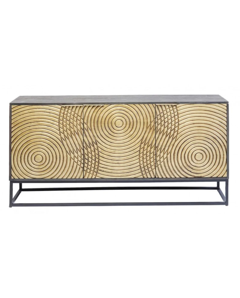 Ce buffet au design contemporain allie une structure en acacia à une façade en manguier, tous deux laqués, montés sur un piètement en acier. Ses trois portes qui s'ouvrent d'une pression du doigt sont décorées de cercles en relief.