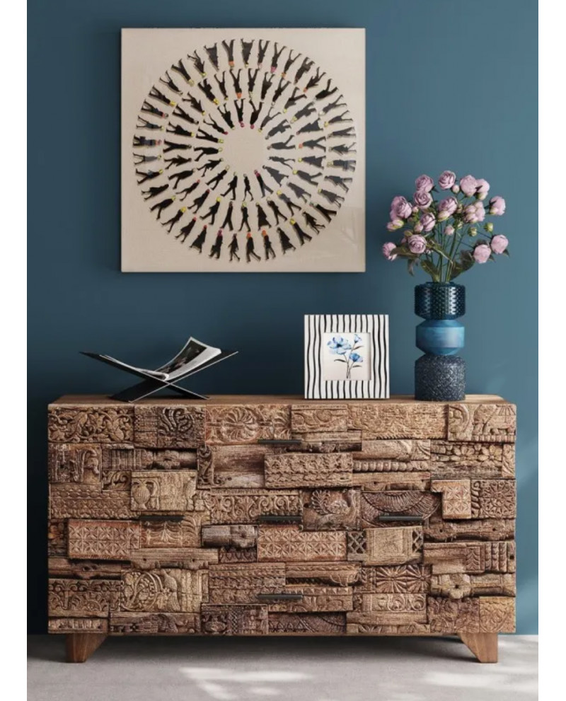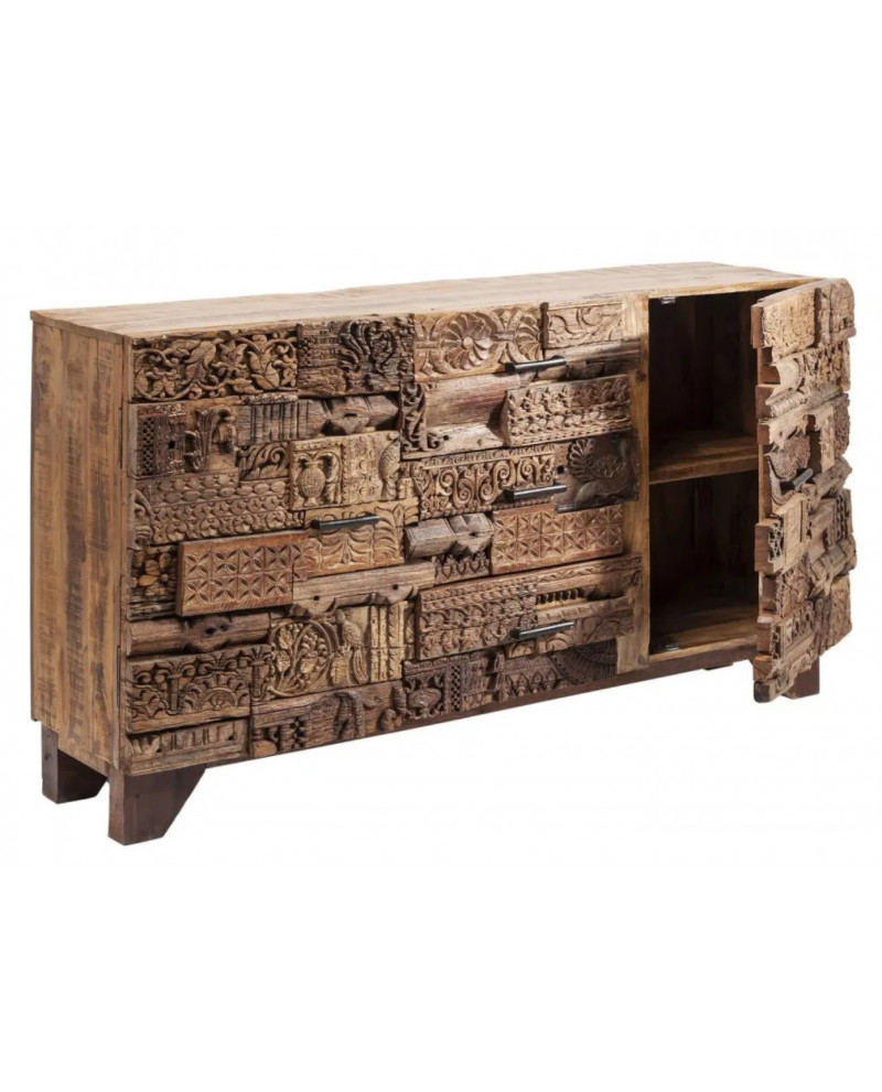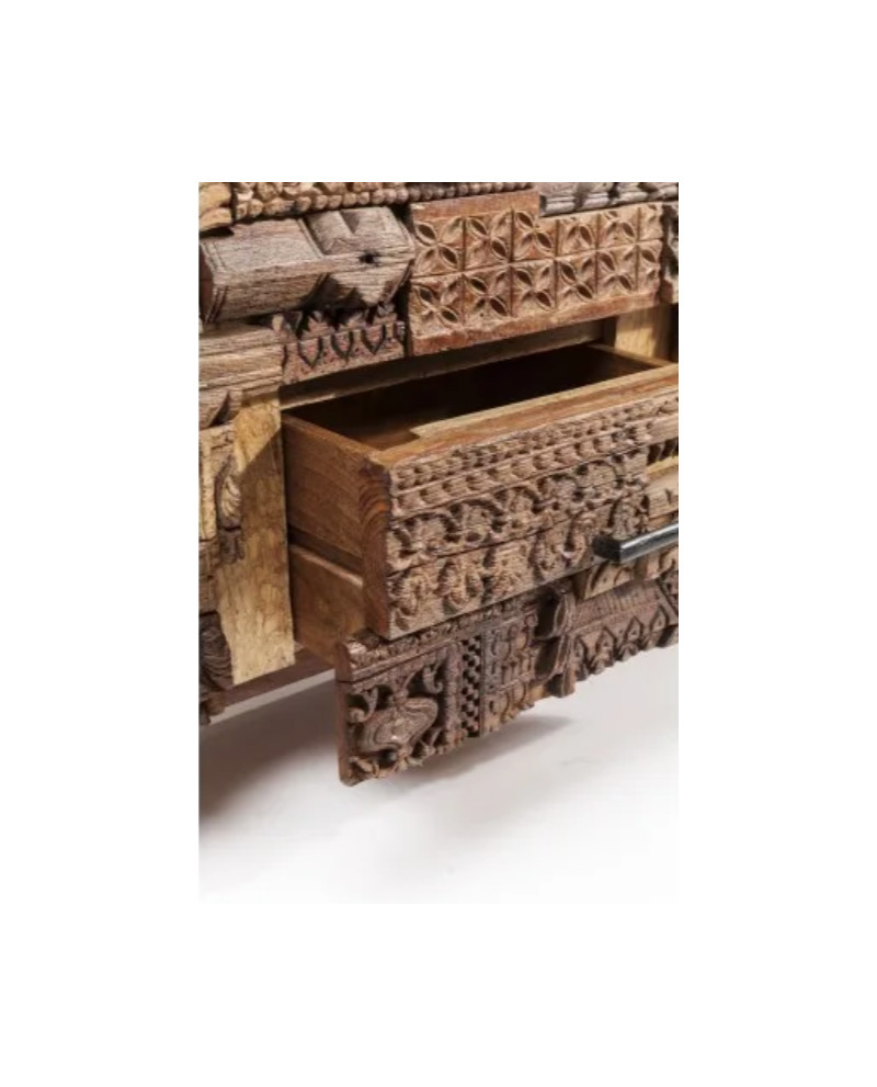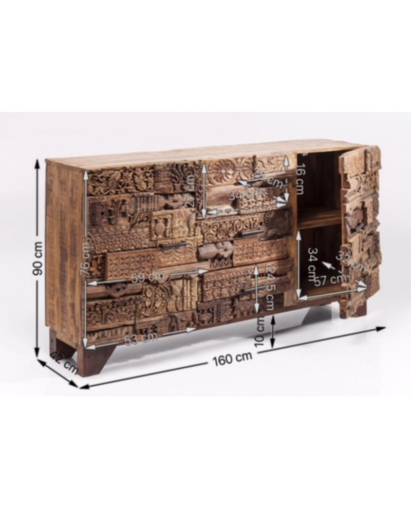 Ce buffet au charme ethnique va vous ensorceler avec sa façade en relief qui s'inspire des civilisations anciennes d'Asie. Approchez-vous et vous pourrez voir un éléphant et un paon parmi la myriade de motifs. Sous le puzzle de pièces de bois exotique se cachent deux portes latérales qui s'ouvrent sur des rangements avec étagère centrale (non ajustable) et trois tiroirs centraux.