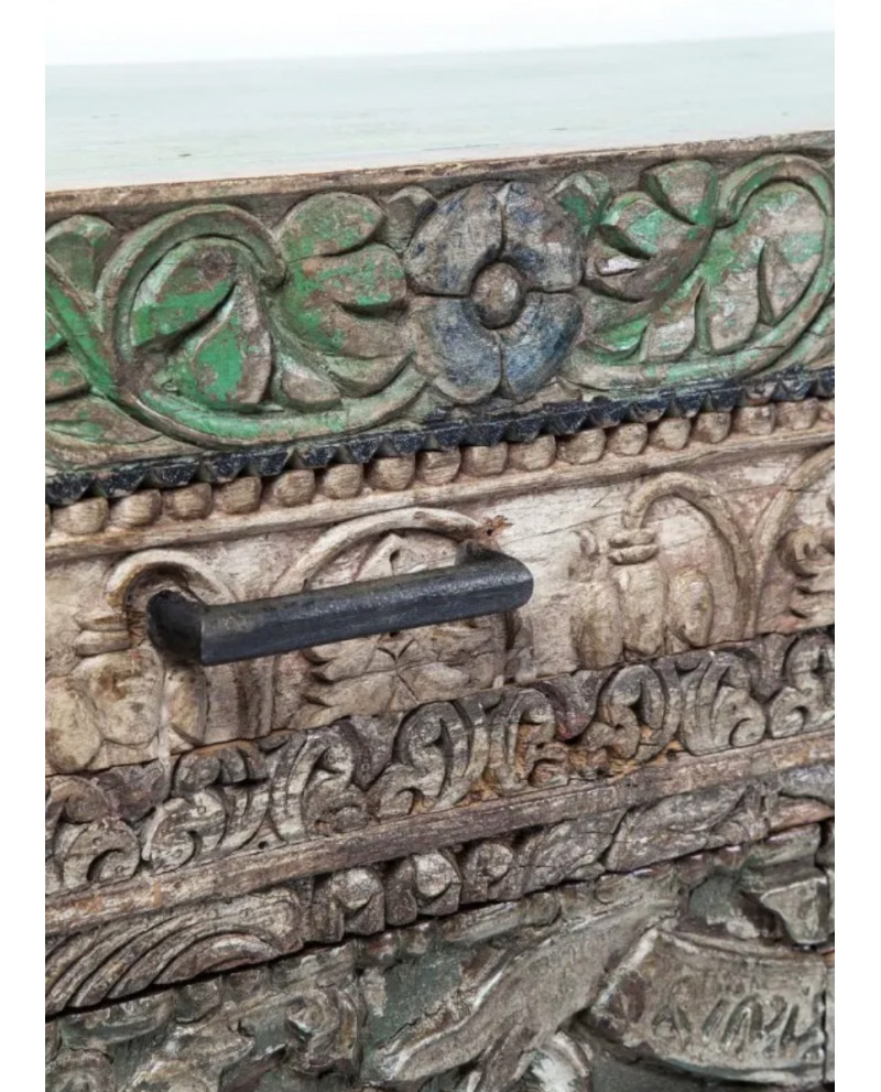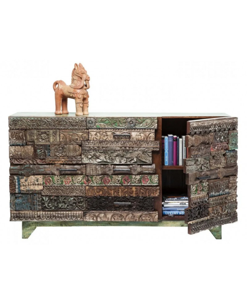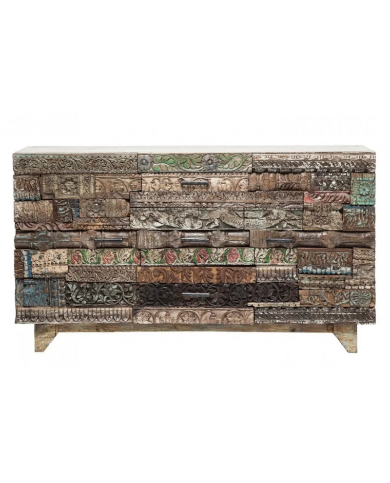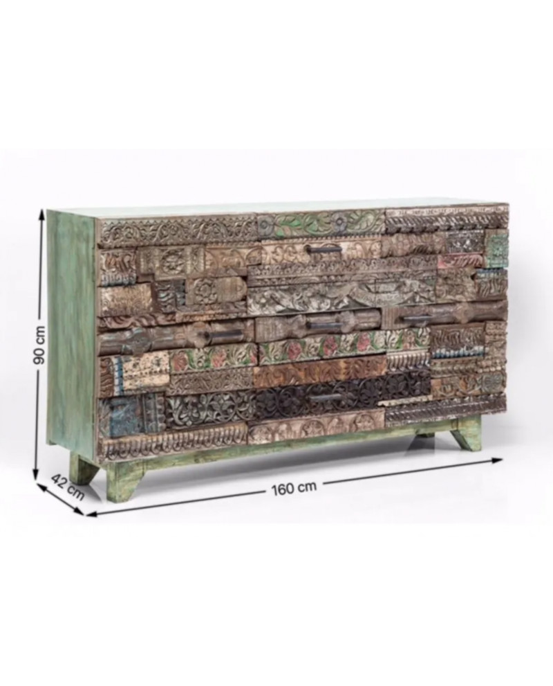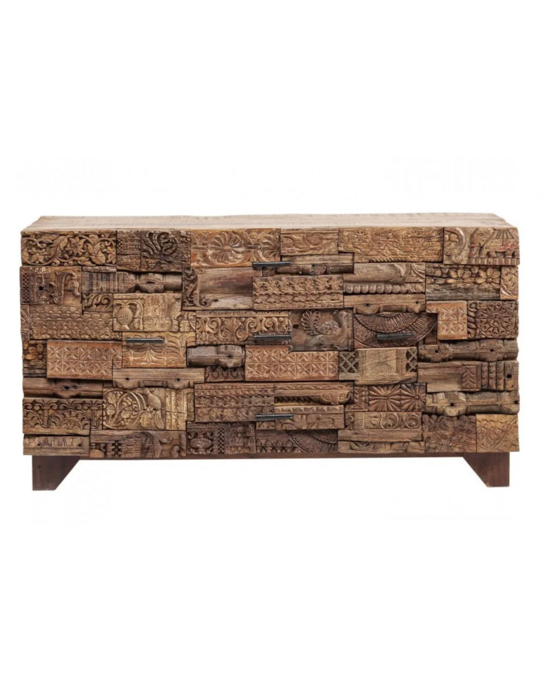 Ce buffet au charme ethnique va vous ensorceler avec sa façade en relief qui s'inspire des civilisations anciennes d'Asie. Approchez-vous et vous pourrez voir un éléphant et un paon parmi la myriade de motifs. Sous le puzzle de pièces de bois exotique se cachent deux portes latérales qui s'ouvrent sur des rangements avec étagère centrale (non ajustable) et trois tiroirs centraux.