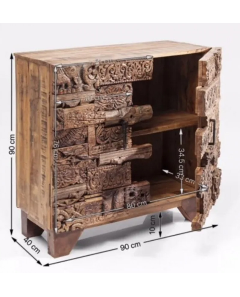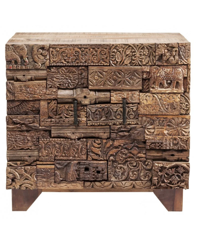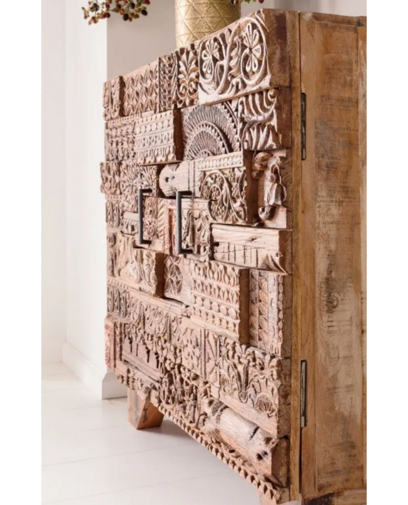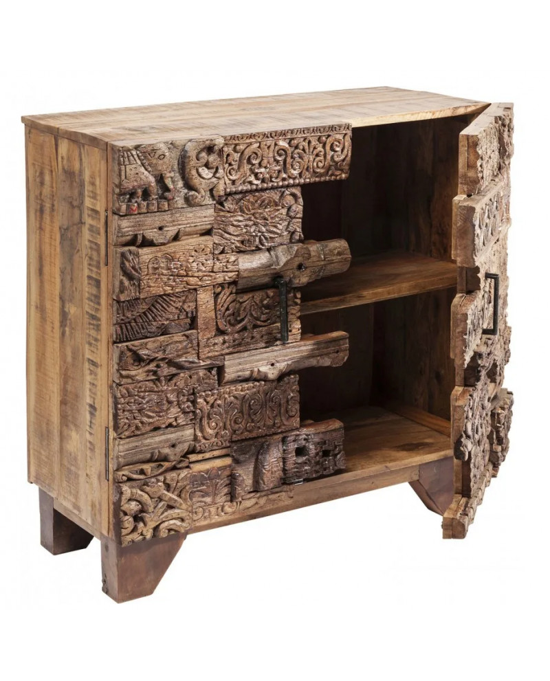 La façade en relief de ce buffet au charme ethnique va vous captiver et apporter une touche exotique et mystérieuse dans votre pièce. La myriade de pièces en bois exotique sculpté assemblé en un puzzle va réveiller votre âme d'aventurier. Les poignées des deux portes qui s'ouvrent sur un grand rangement se veulent discrètes pour ne pas détourner l'attention.