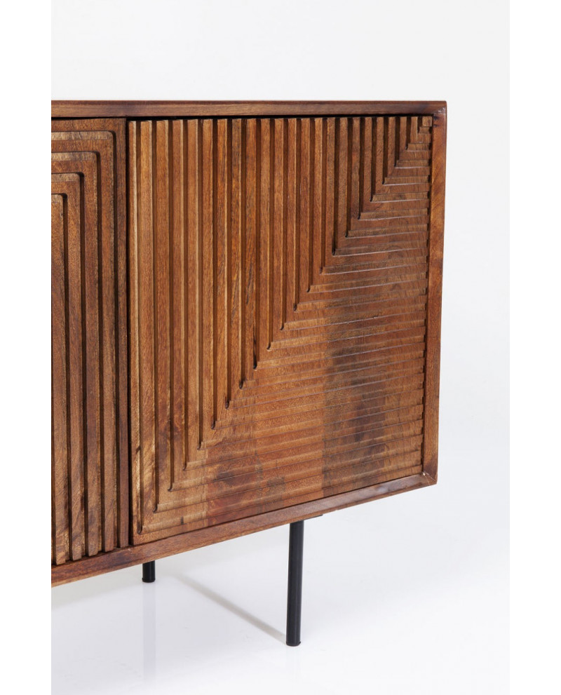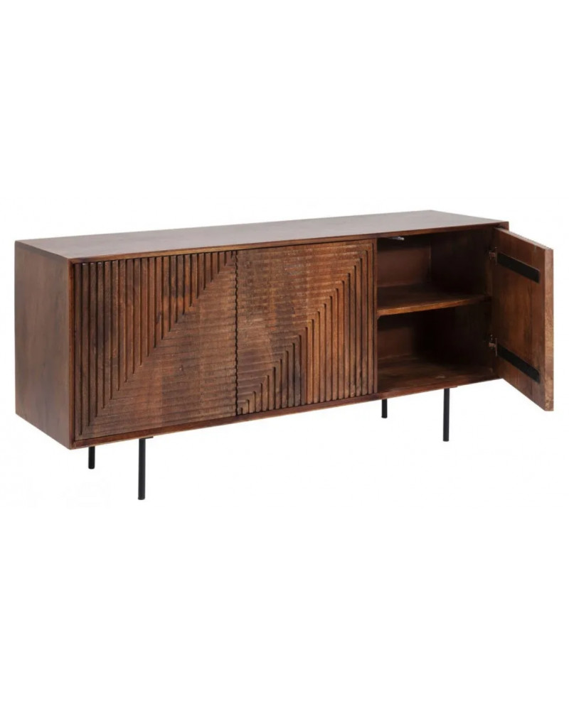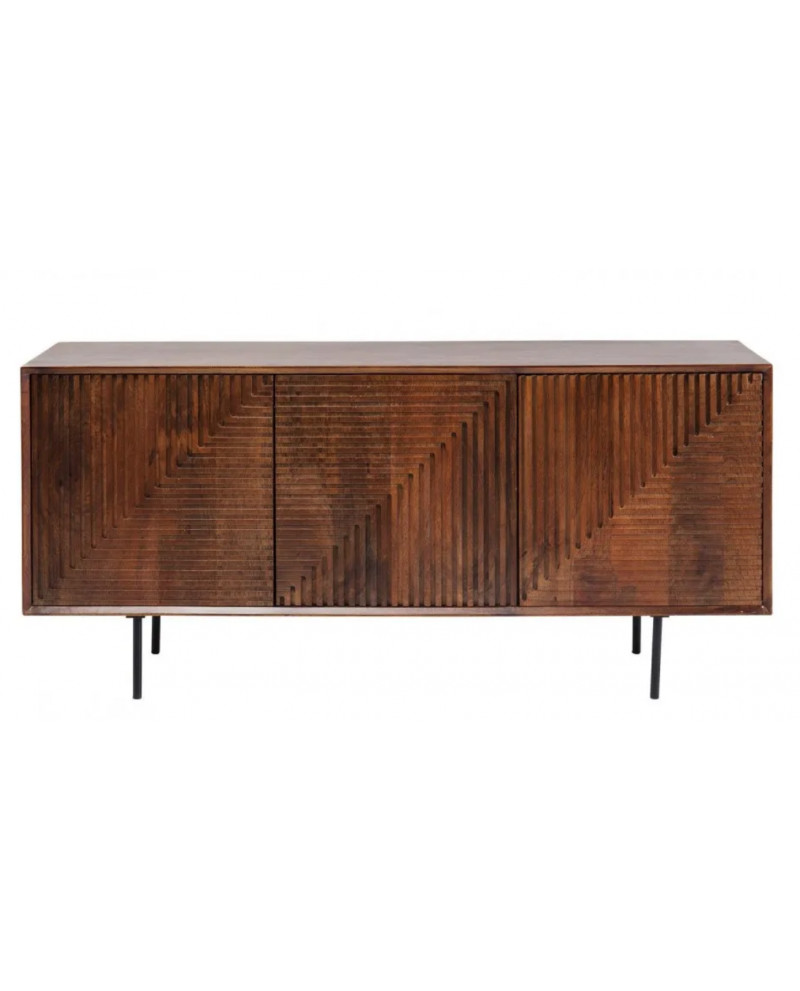Ce buffet en bois de manguier laqué s'inscrit dans un univers contemporain avec ses trois portes aux façades trompe-l'œil. L'effet d'illusion est créé par une alliance de lignes horizontales et verticales associée aux nuances du bois.