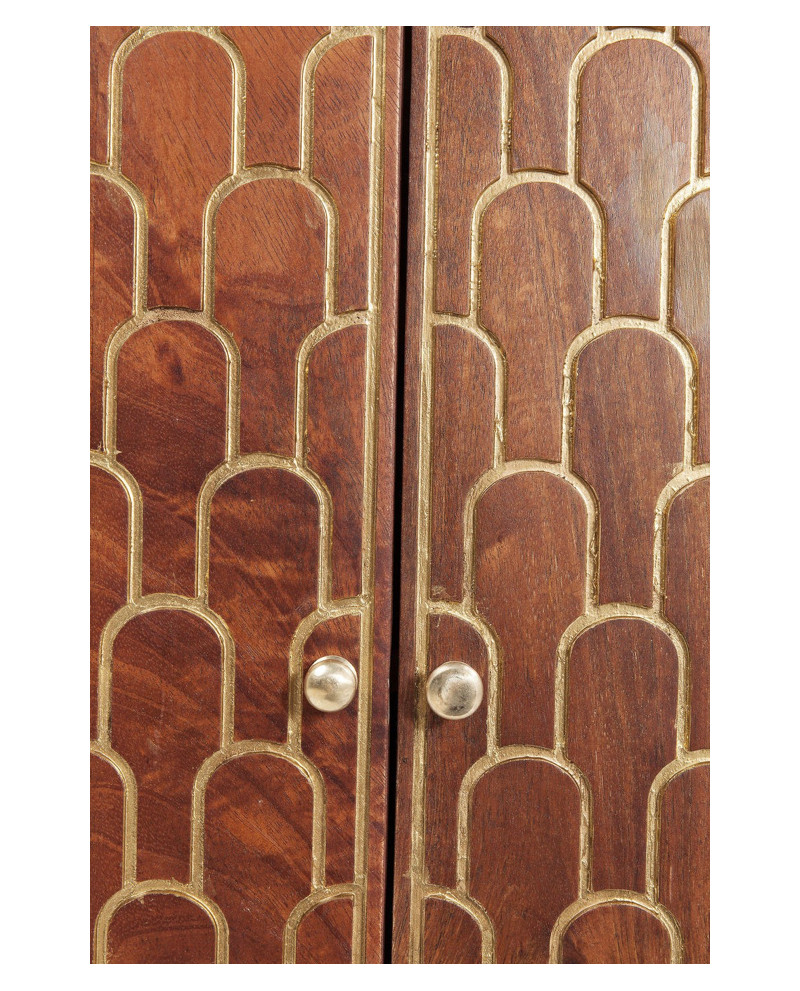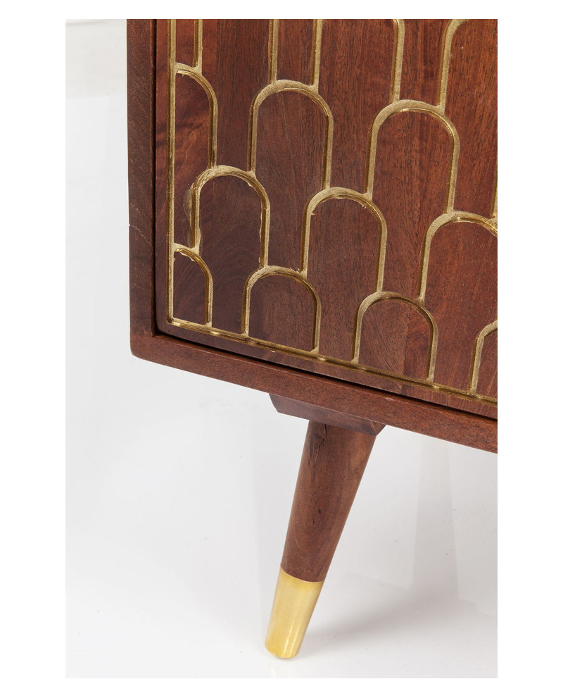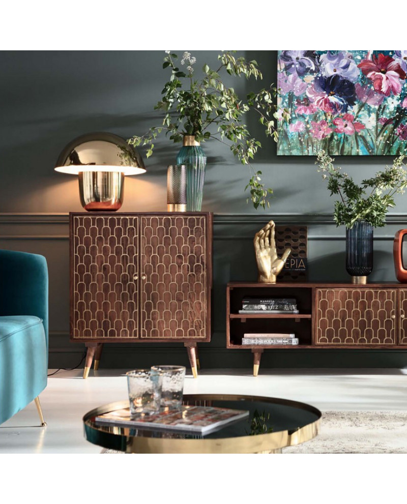 Ce buffet s'inscrit dans un style rétro avec sa structure en manguier laqué associée à des détails dorés. Ses deux portes sont décorées de motifs Art Déco qui apportent un style chic et raffiné au meuble. La collection Muskat propose également un chevet, une commode, un meuble TV et une armoire pour vous permettre d'harmoniser votre intérieur.