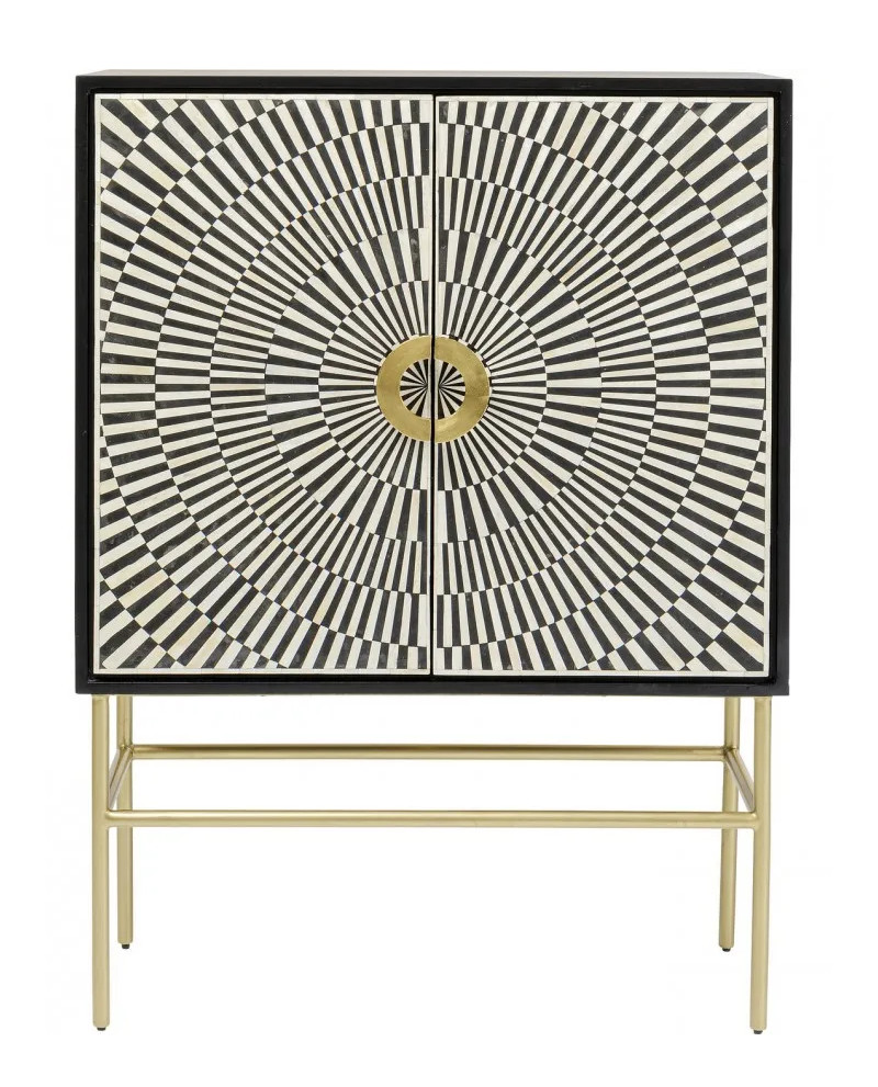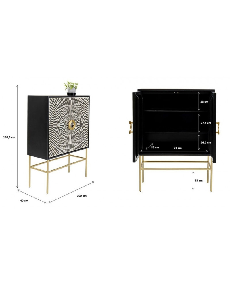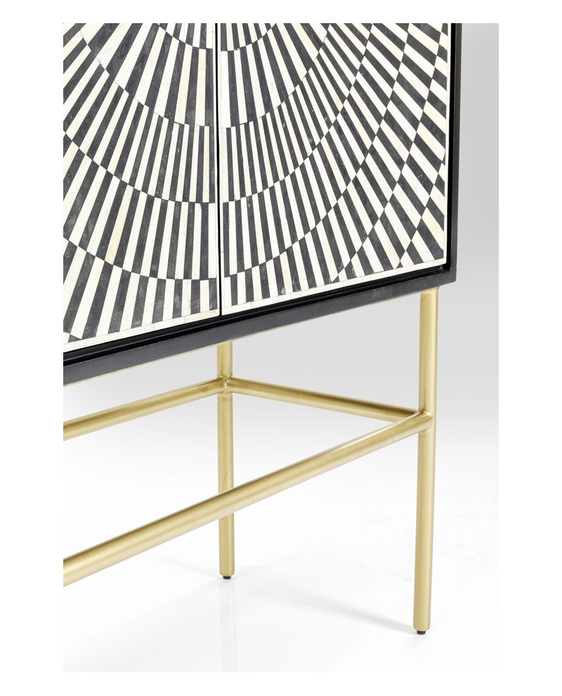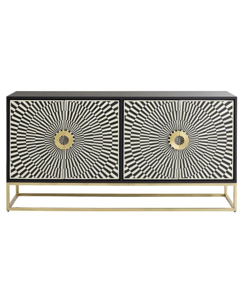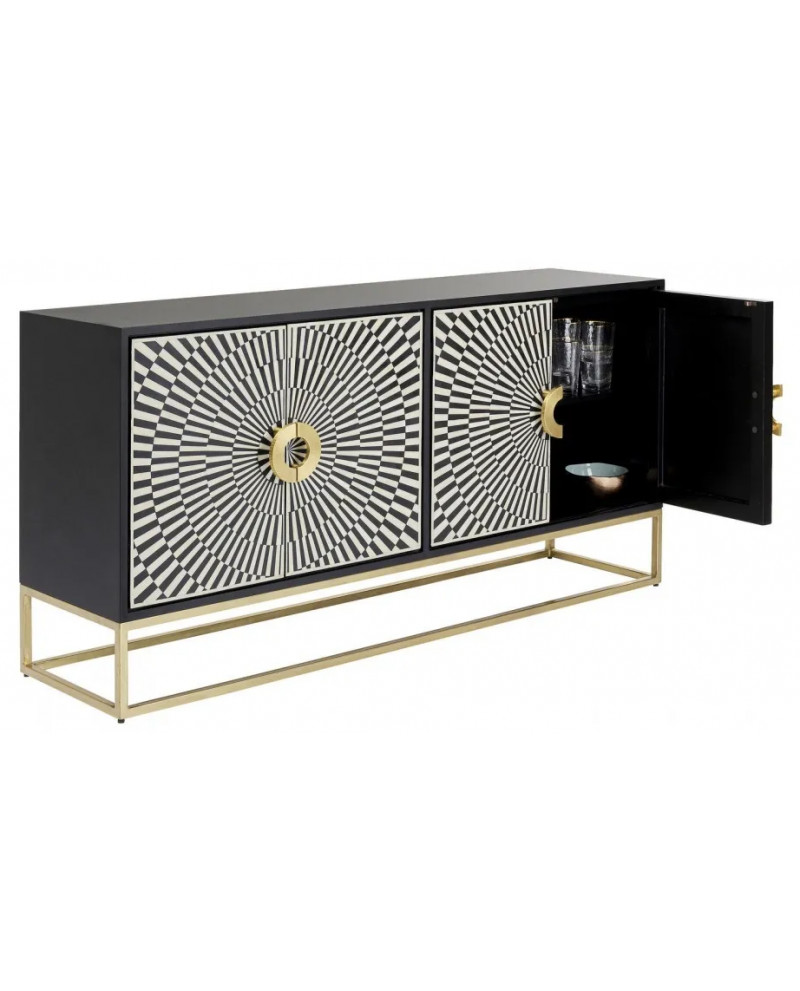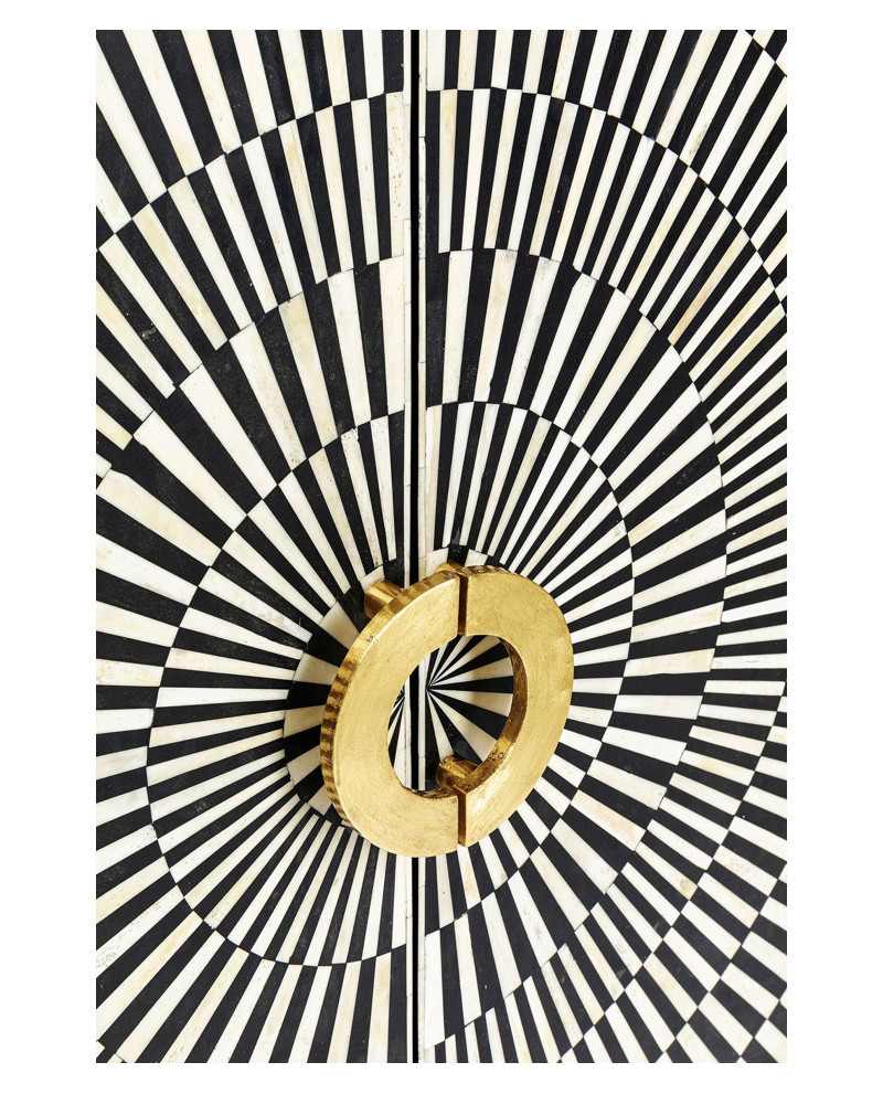 Laissez vous hypnotiser par le design en spirale noir et blanc de ce buffet au style rétro qui dispose de deux grands rangements avec une étagère centrale. Les motifs lui donnent du relief et créent un effet d’optique qui se resserre vers les poignées dorées rondes, le tout dans un style élégant.