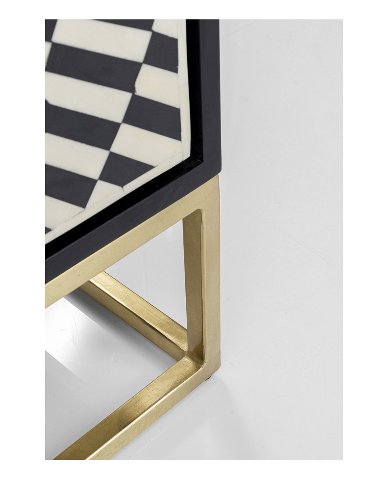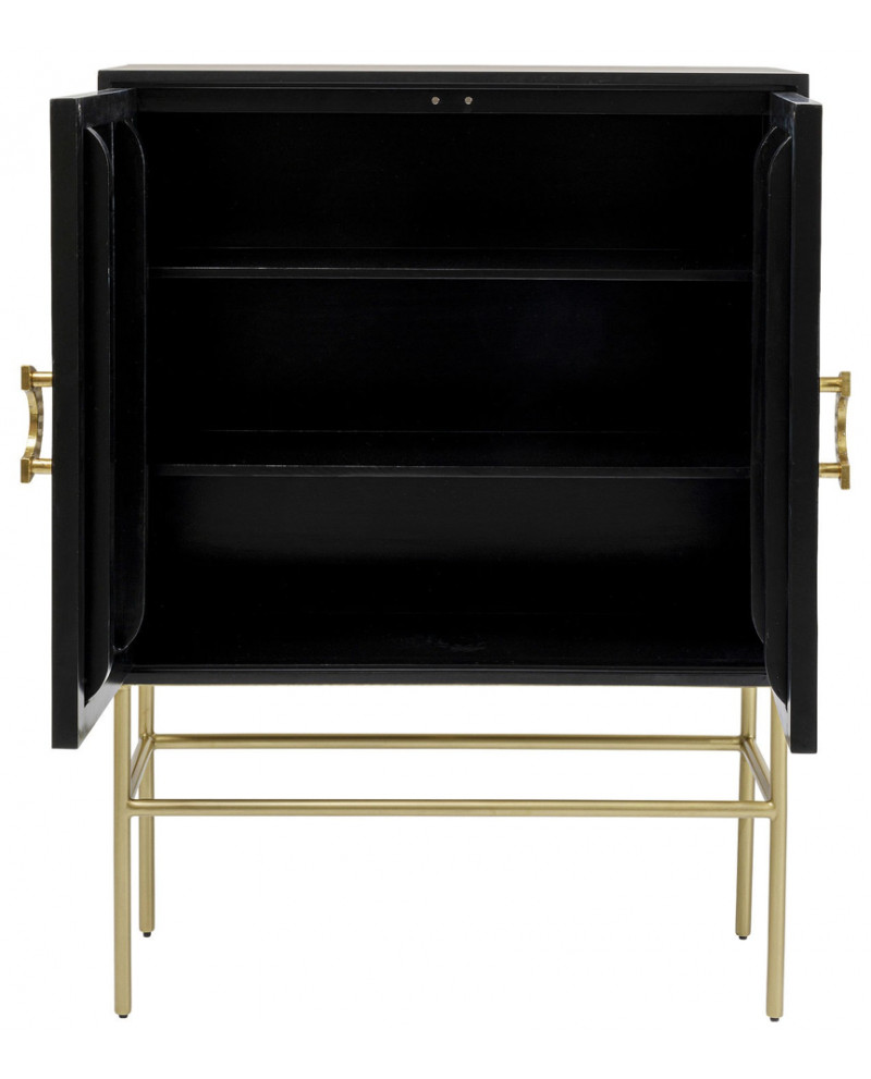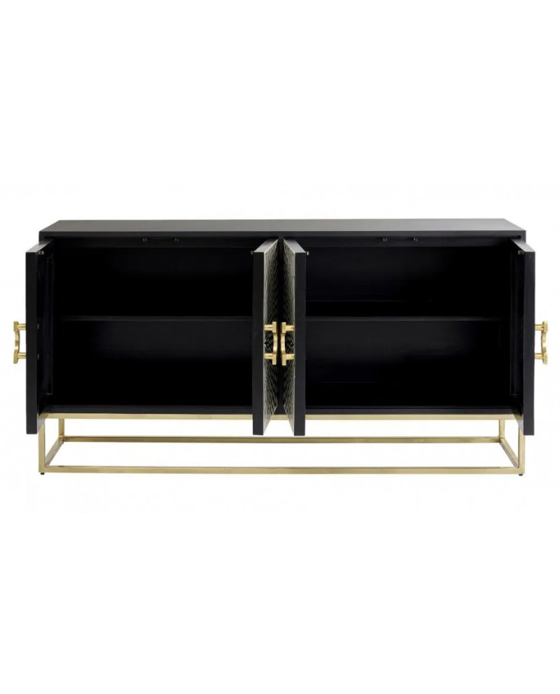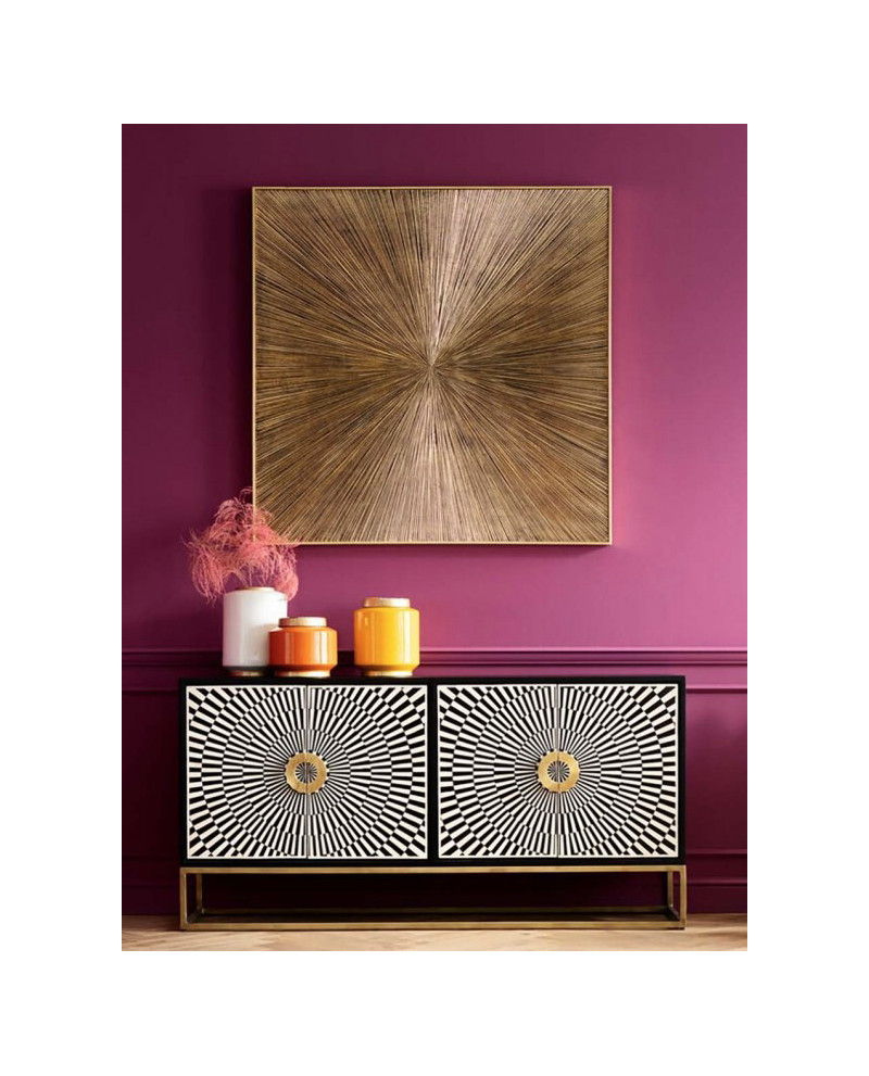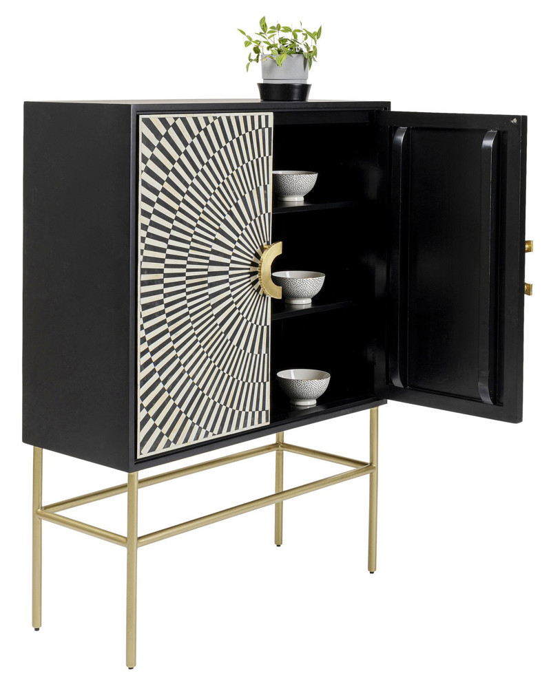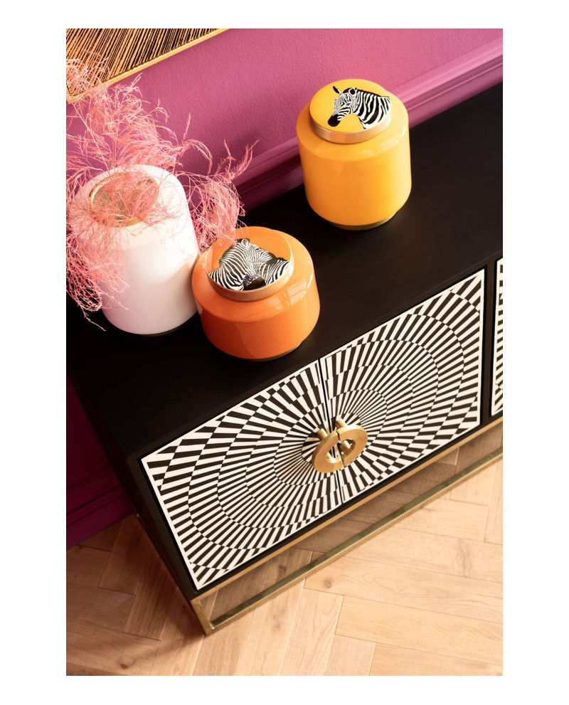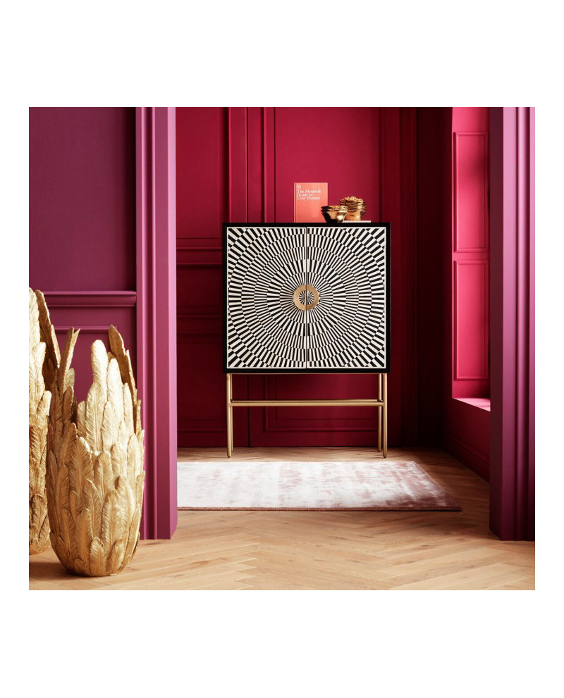 Laissez vous hypnotiser par le design en spirale noir et blanc de ce buffet au style rétro qui dispose de deux grands rangements avec une étagère centrale. Les motifs lui donnent du relief et créent un effet d’optique qui se resserre vers les poignées dorées rondes, le tout dans un style élégant.