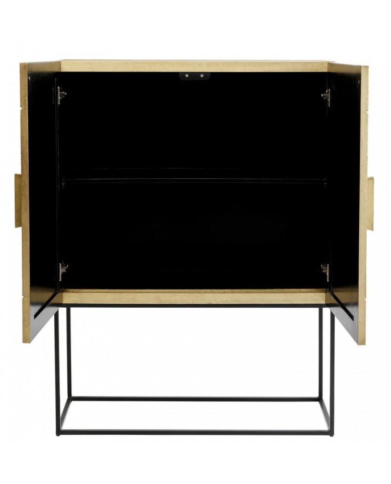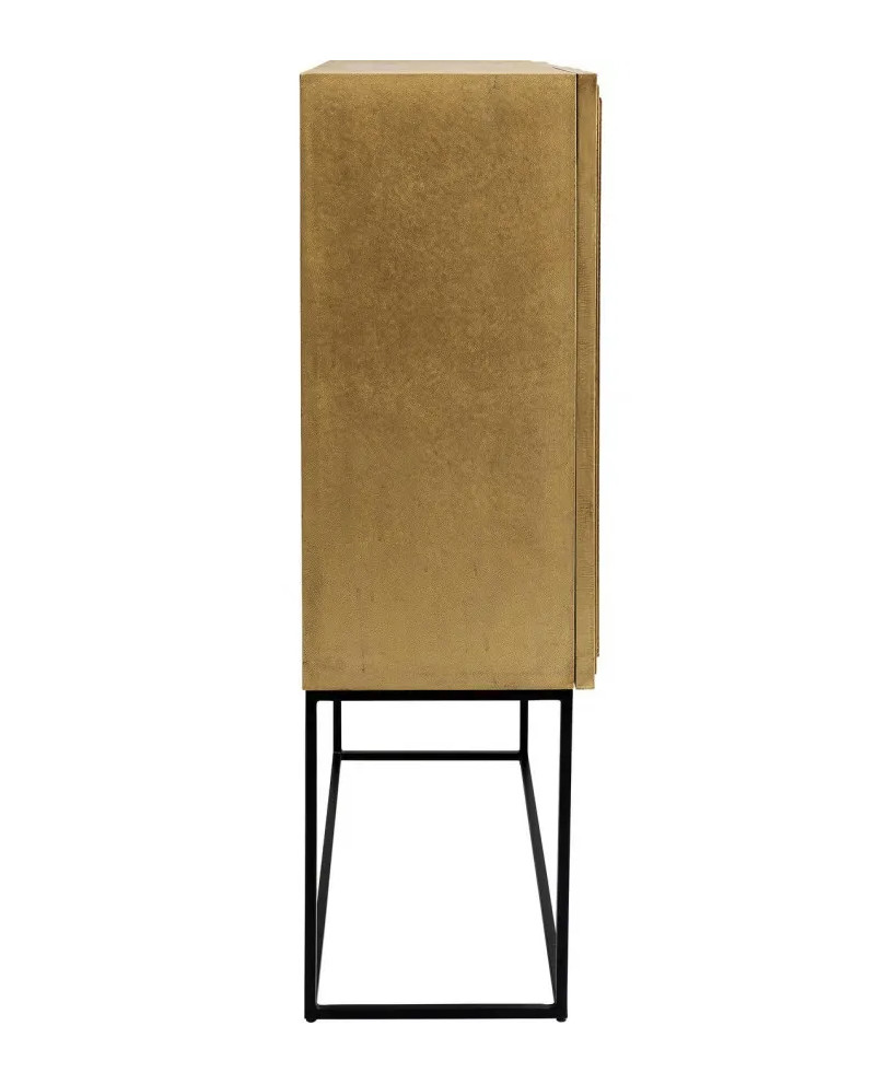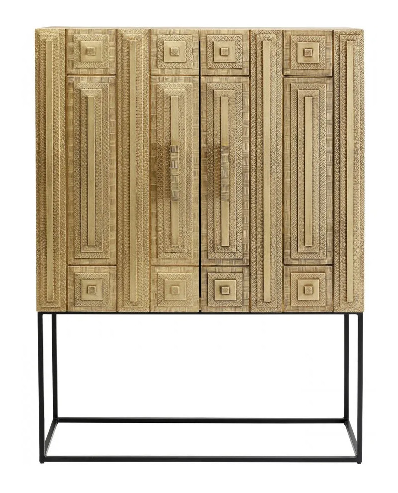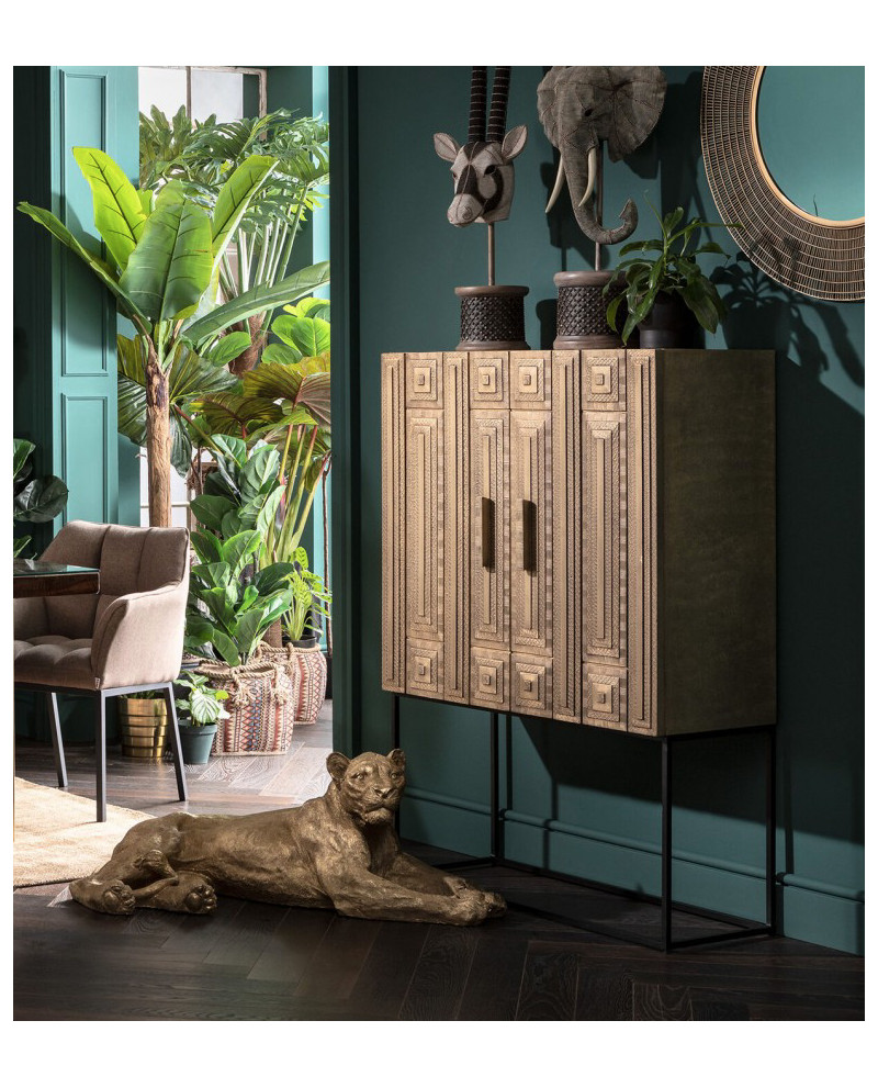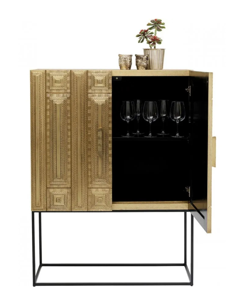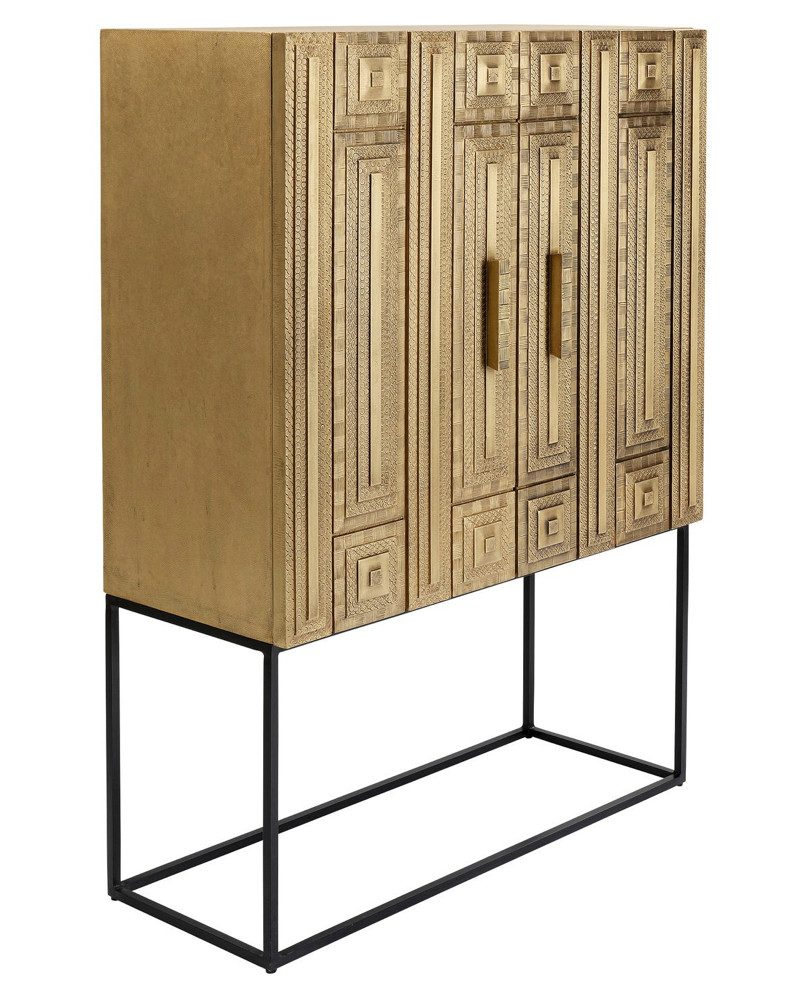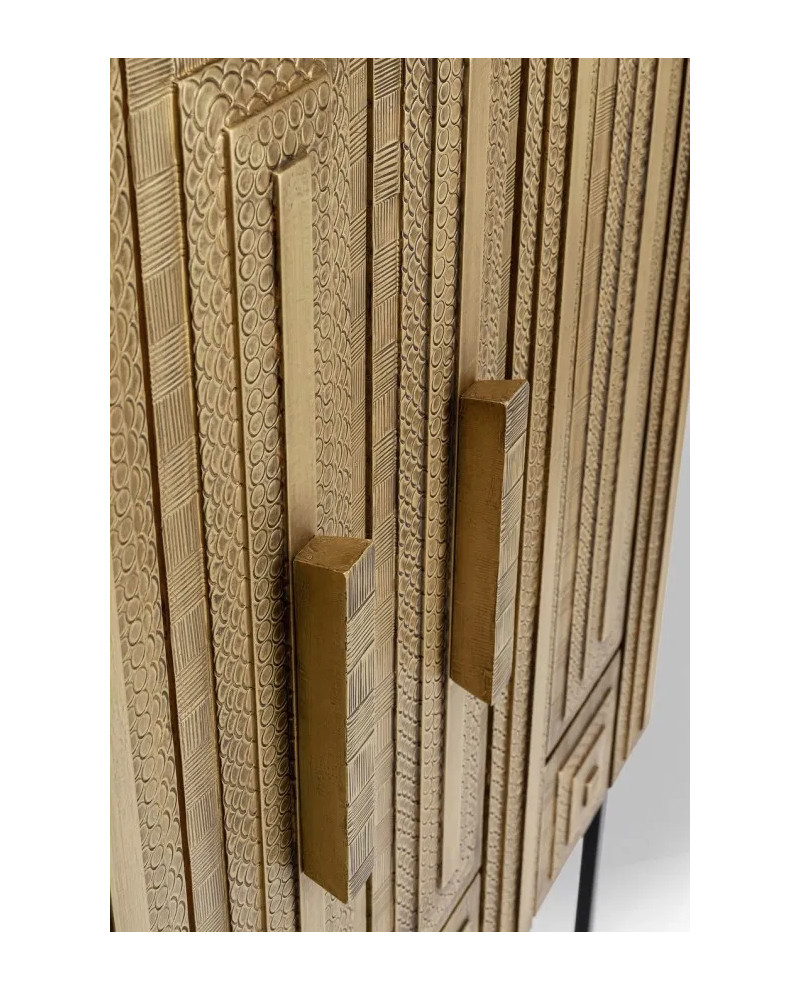 Ce buffet haut s'inscrit dans un style oriental avec ses deux grandes portes aux détails sculptés à la main. À l'intérieur, vous y trouverez deux grands rangements avec étagère centrale pour y placer vos verres, assiettes ou autres vaisselles. Il sera parfait pour apporter un esprit "mille et une nuit" grâce à sa teinte dorée étincelante.