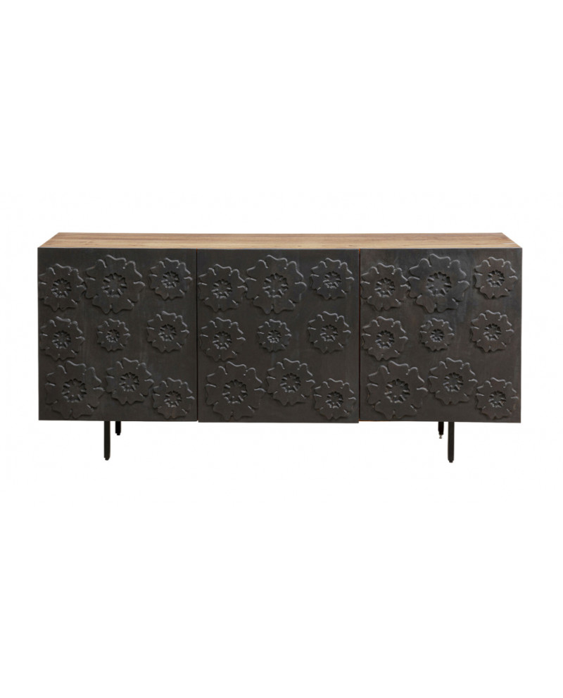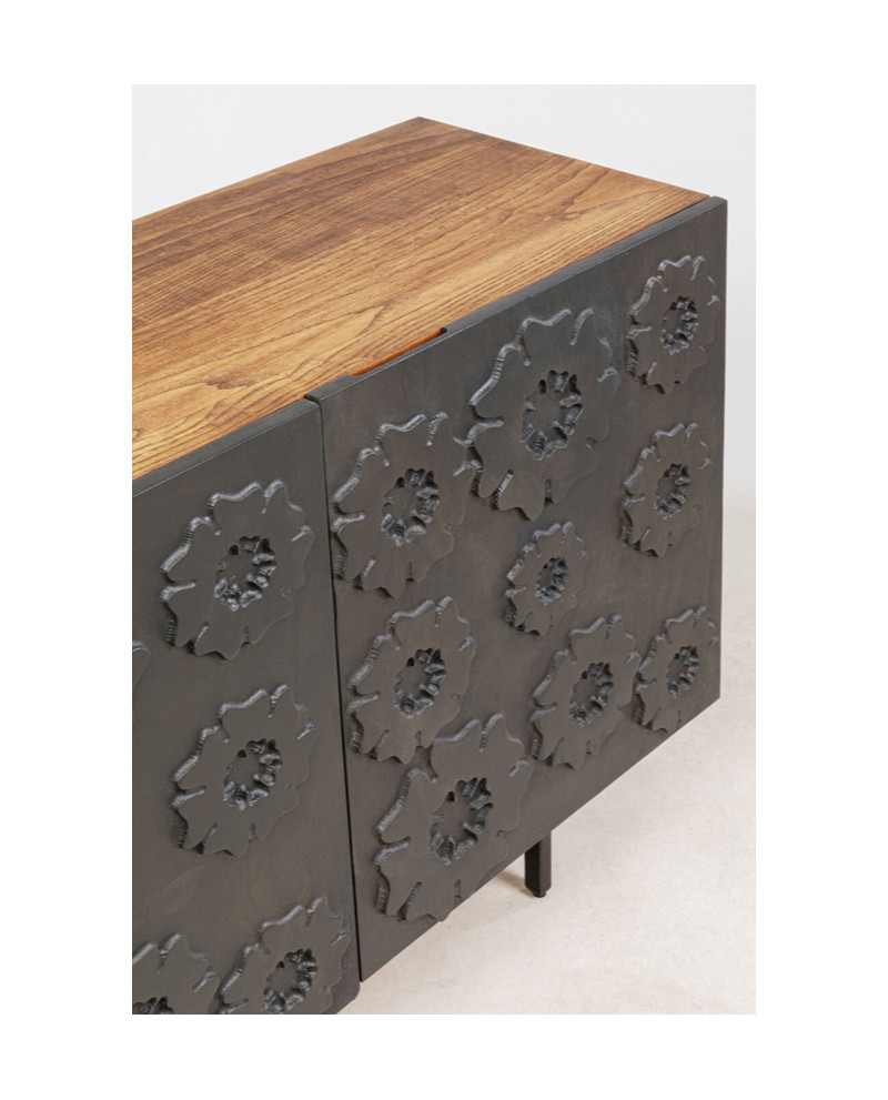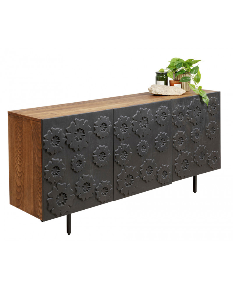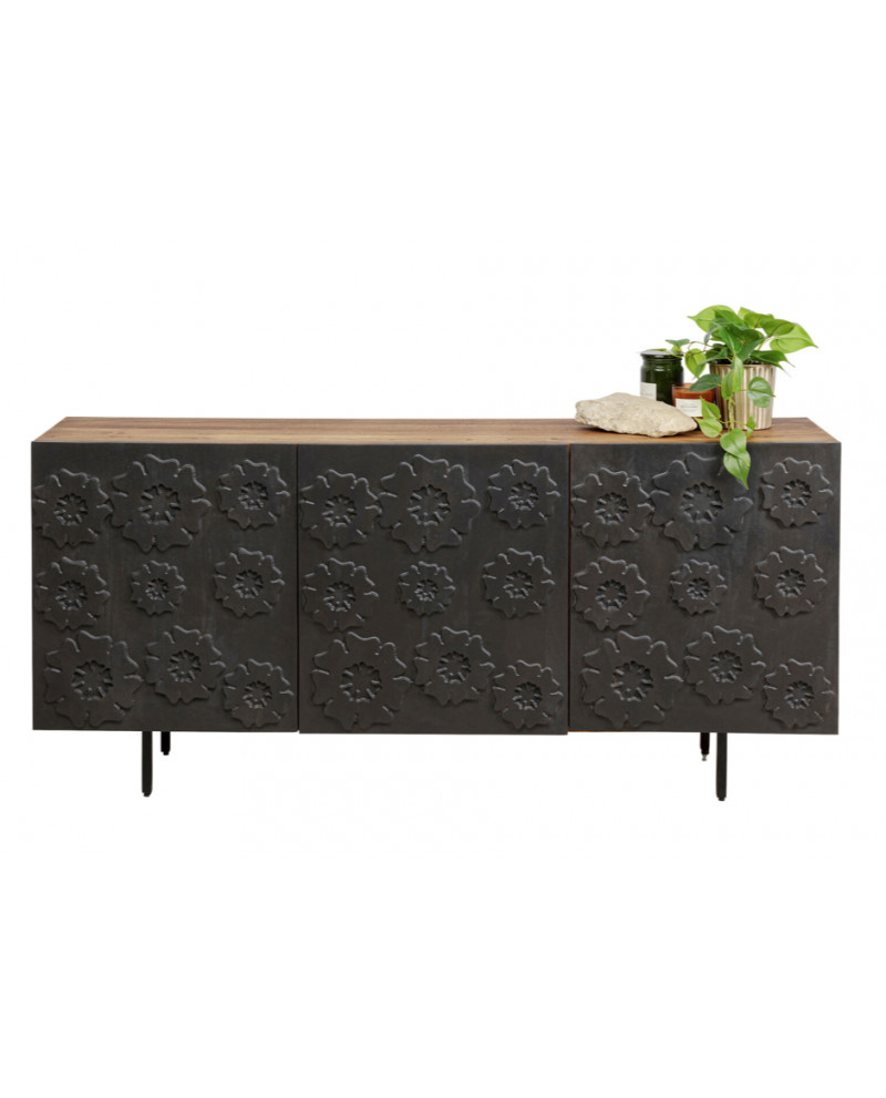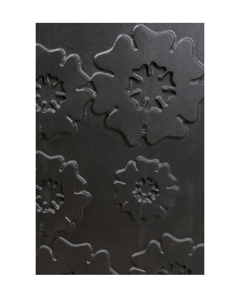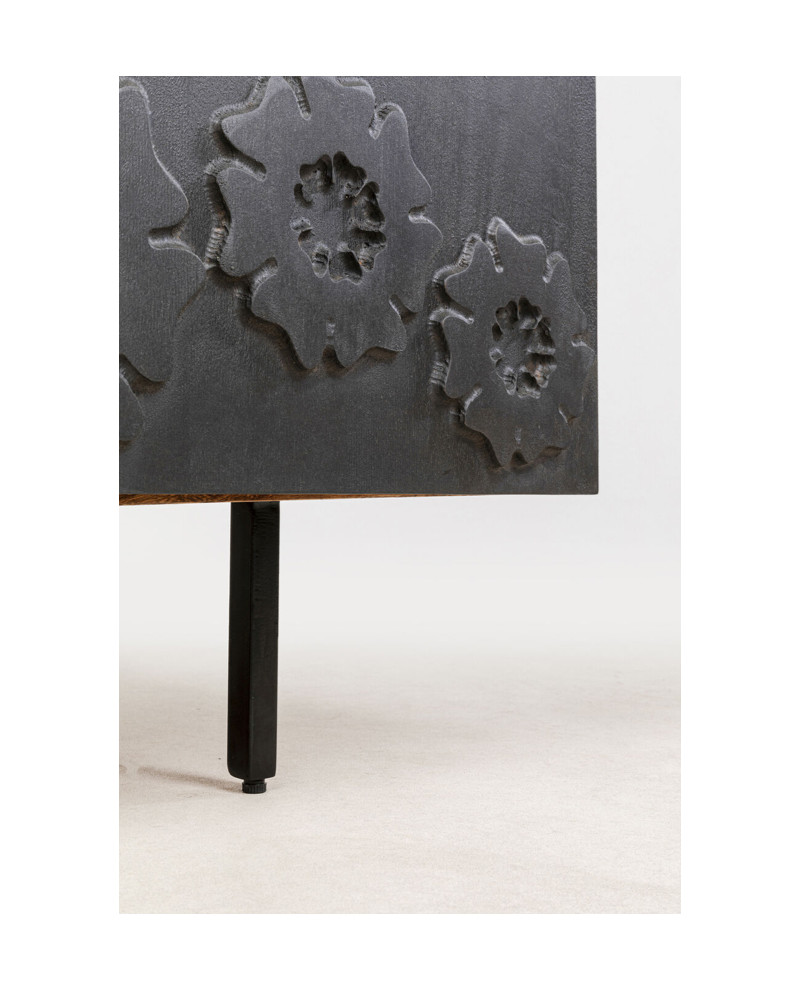 Avec le sideboard Fiori, vous apportez une combinaison de fonctionnalité et de design dans votre intérieur. Le sideboard fait à la main a une façade sombre avec un motif floral abstrait qui fait de chaque pièce une œuvre d'art unique. Le sideboard est composé de bois de manguier laqué et de pieds en acier revêtus par poudre pour la stabilité et l'élégance. La fonction soft-close et les charnières réglables assurent une manipulation aisée. Le design moderne, auquel la façade en particulier confère une touche de charme, fait du sideboard Fiori un meuble design durable. Avec le sideboard Fiori, vous apportez une combinaison de fonctionnalité et de design dans votre intérieur.