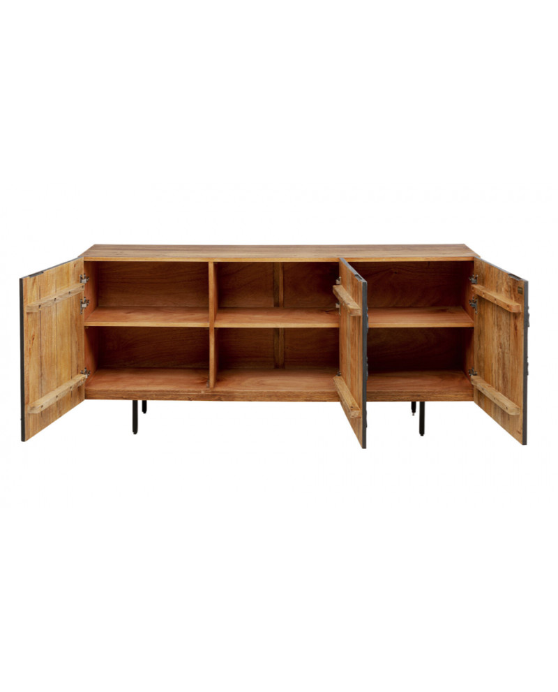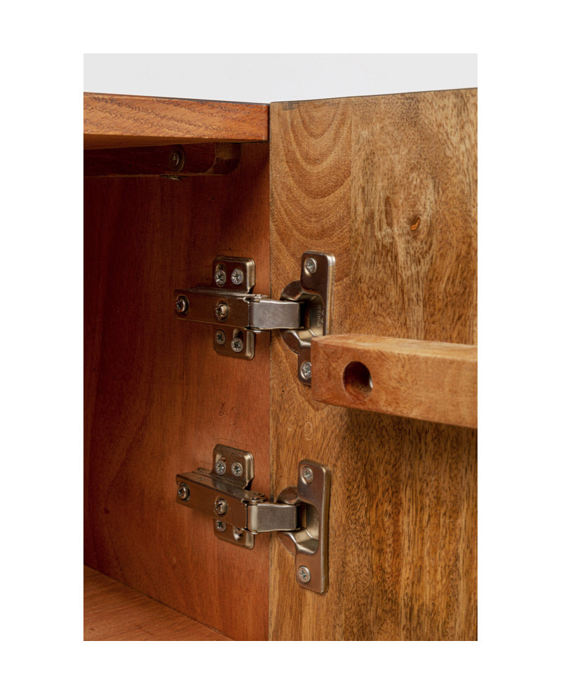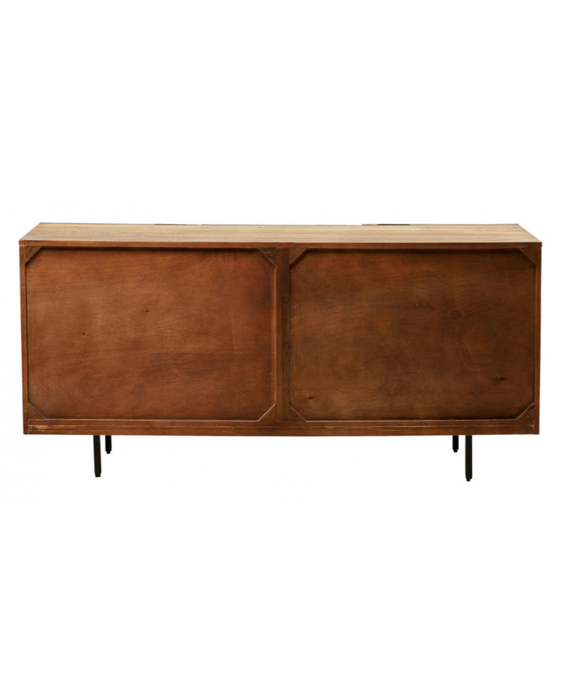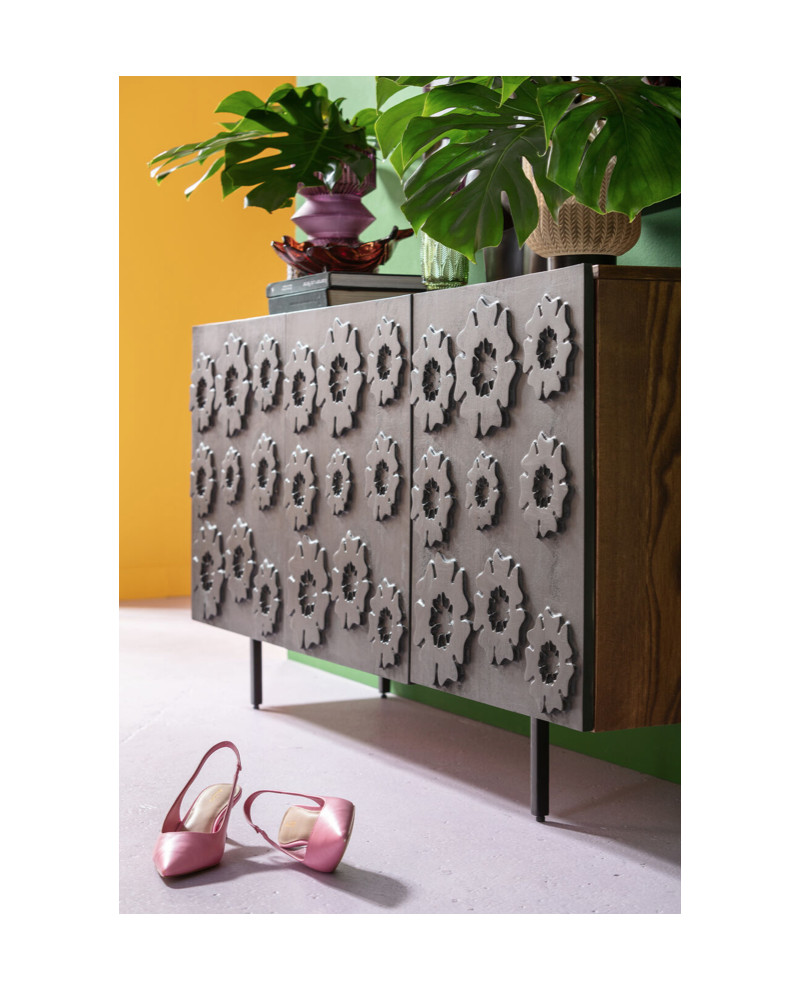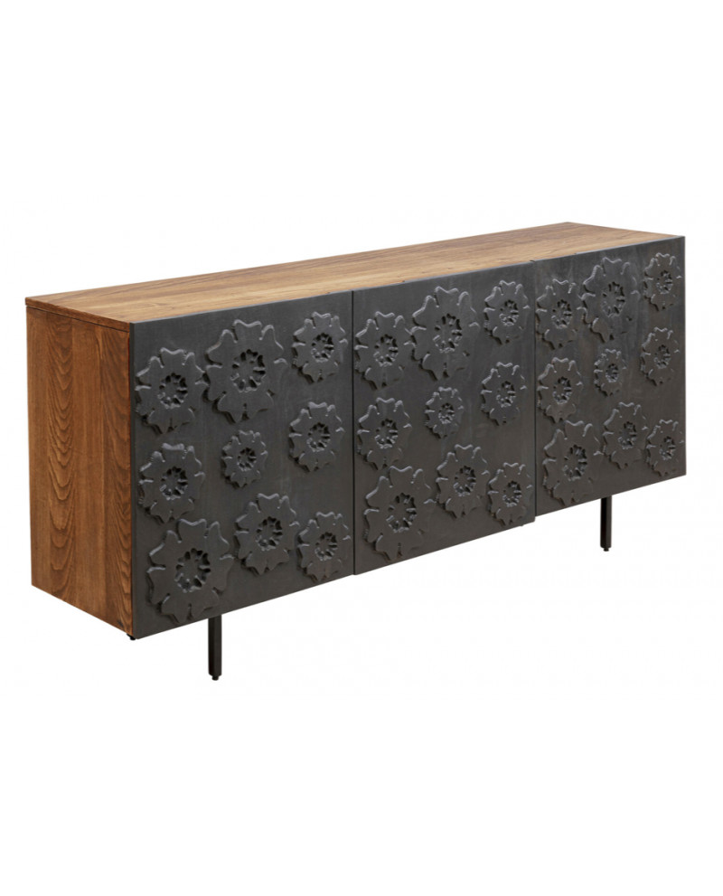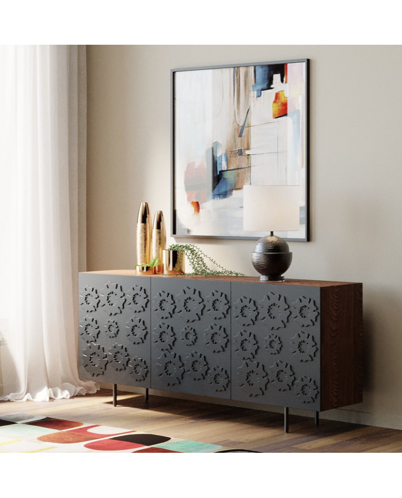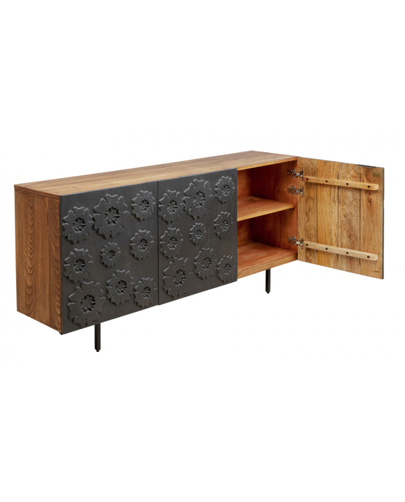 Avec le sideboard Fiori, vous apportez une combinaison de fonctionnalité et de design dans votre intérieur. Le sideboard fait à la main a une façade sombre avec un motif floral abstrait qui fait de chaque pièce une œuvre d'art unique. Le sideboard est composé de bois de manguier laqué et de pieds en acier revêtus par poudre pour la stabilité et l'élégance. La fonction soft-close et les charnières réglables assurent une manipulation aisée. Le design moderne, auquel la façade en particulier confère une touche de charme, fait du sideboard Fiori un meuble design durable. Avec le sideboard Fiori, vous apportez une combinaison de fonctionnalité et de design dans votre intérieur.