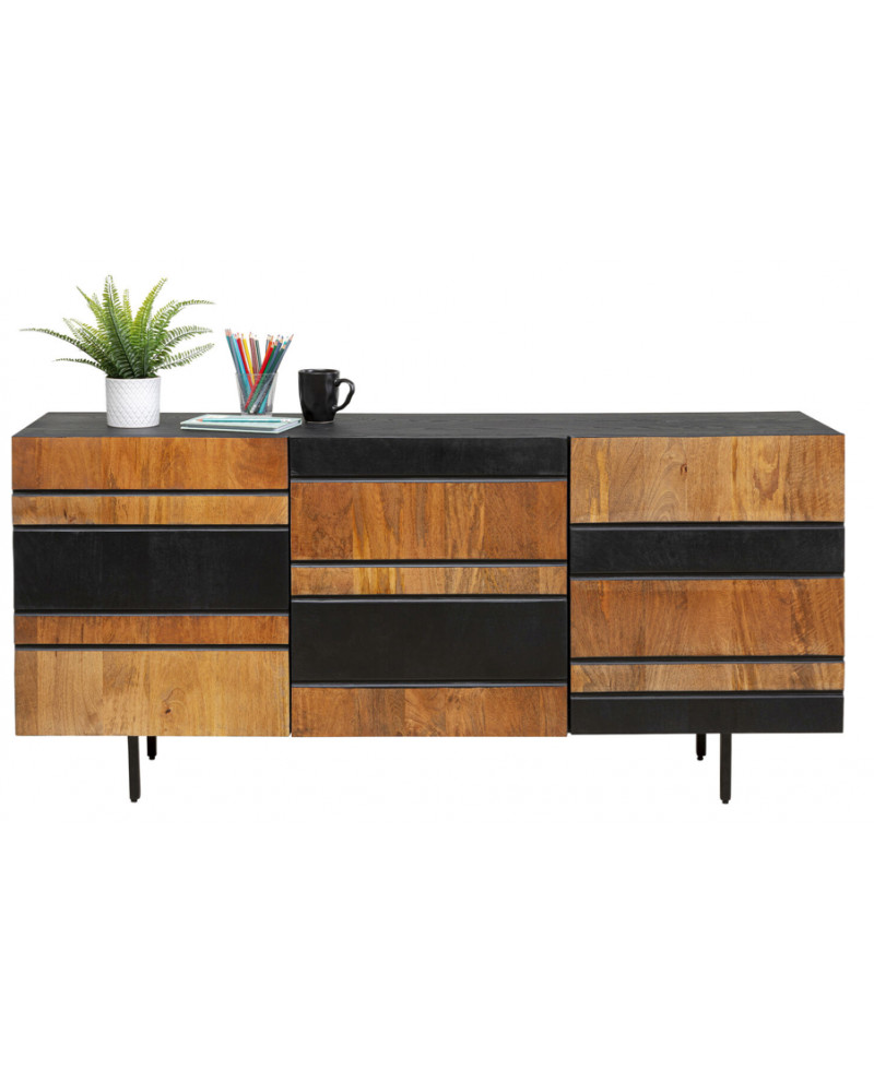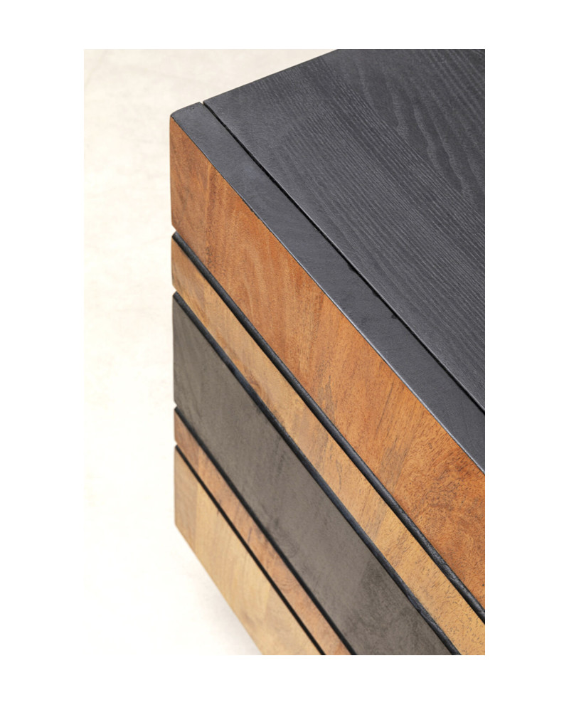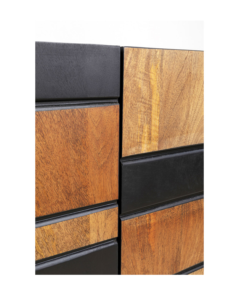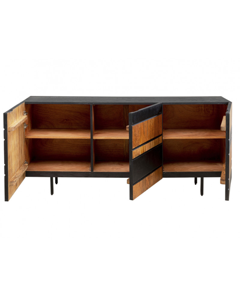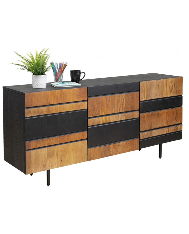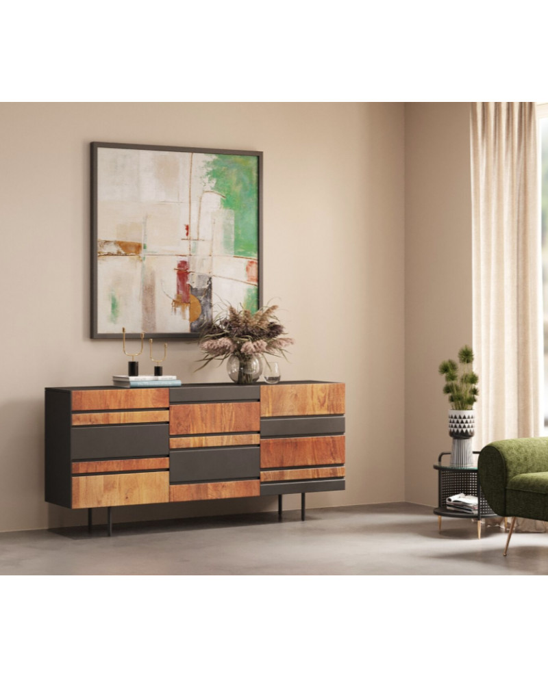 Le sideboard en bois fabriqué à la main est un atout pour chaque salon. Le design remarquable de la façade, avec des parties de couleur naturelle et des parties laquées en noir, confère au meuble un look confortable et moderne. Le sideboard offre suffisamment d'espace de rangement pour les livres, la vaisselle ou les décorations. Avec sa finition de haute qualité et son aspect individuel, le sideboard est un investissement qui s'avère rentable à long terme.