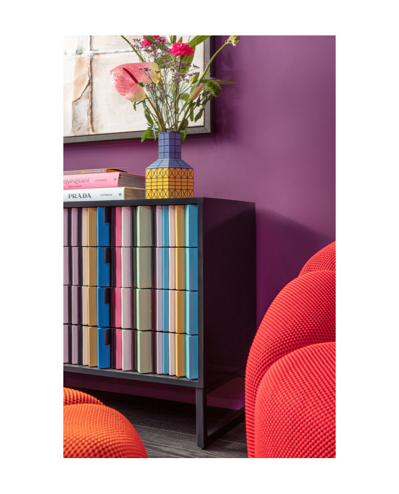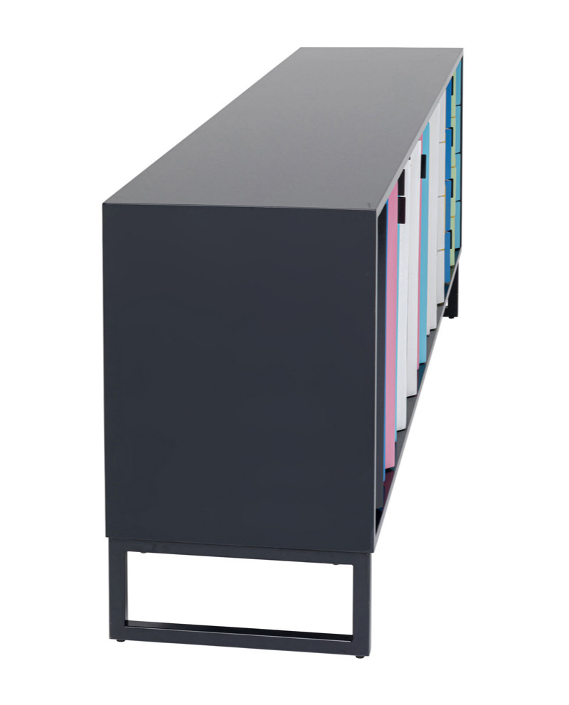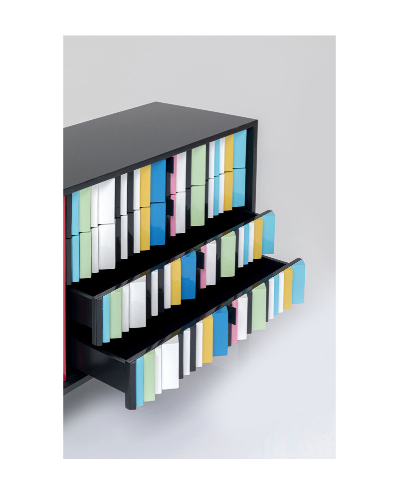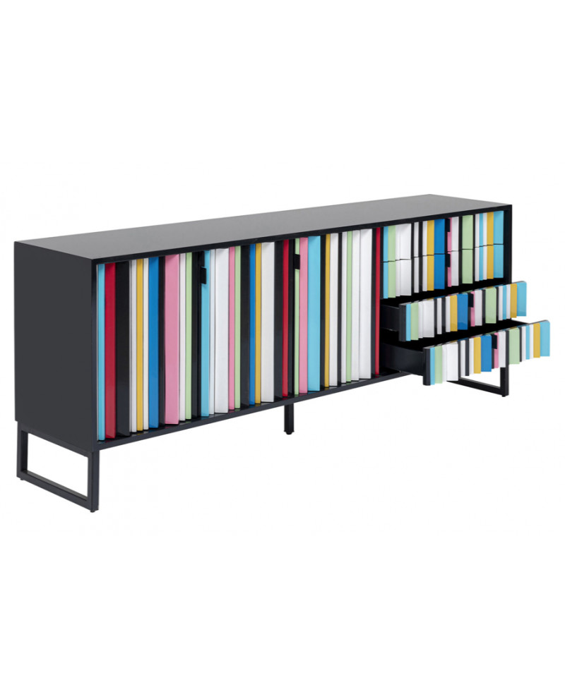 Concertina est une collection imaginée par le designer danois Morten Georgsen. Simple mais pleine de caractère, telle est sa philosophie. Pour ce buffet, il a doté les façades vives et colorées d'un cadre épuré, d'une structure et d'un corps rectilignes. Le designer attire ainsi tous les regards sur ce feu d'artifice de couleurs et de formes. Ce buffet est unique et conservera son charme même après de nombreuses années. Son style s'intègre facilement à tout intérieur moderne.