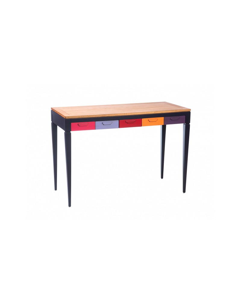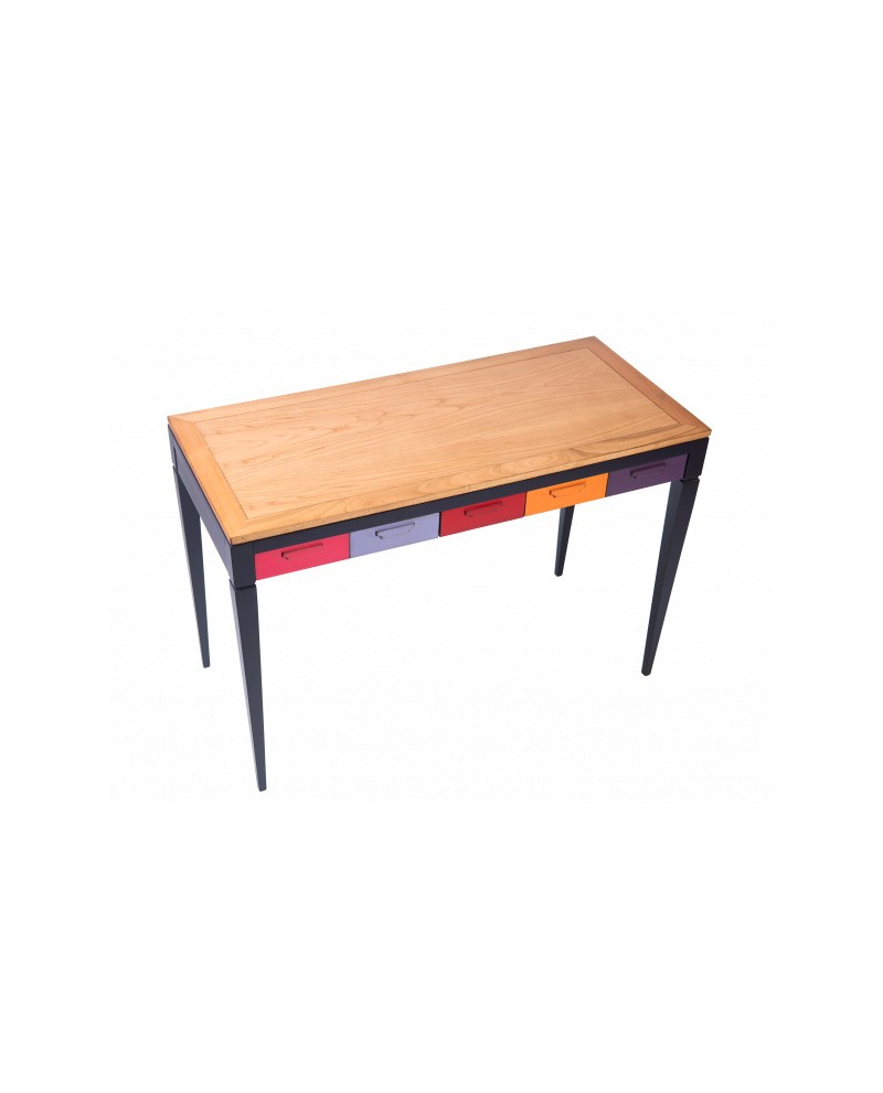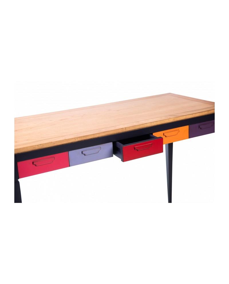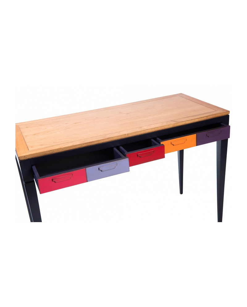 Bureau 3 tiroirs (2 grands sur les côtés + 1 petit au centre) bois merisier massif et hêtre. Structure laqué noir, décor portes photos laque multi-couleurs, plateau merisier délavé.