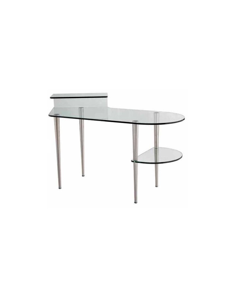 Bureau informatique DESK dessus et étagère latérale en verre épaisseur 10mm, 1 support écran, 1 support imprimante, 4 pieds chromés.