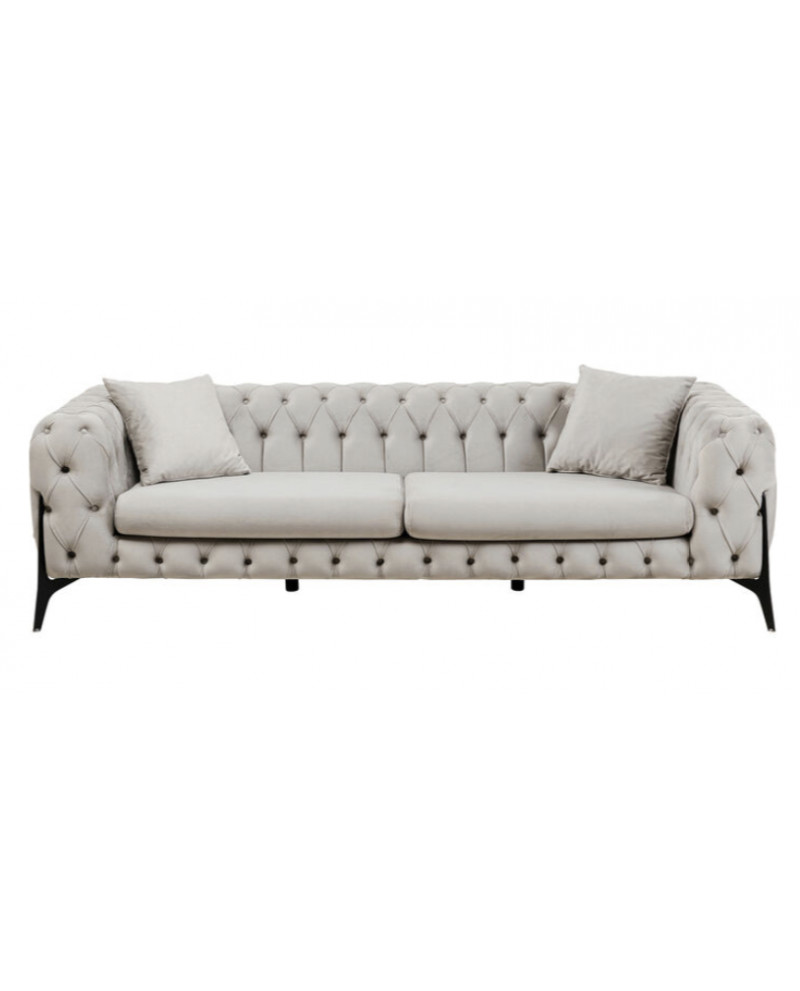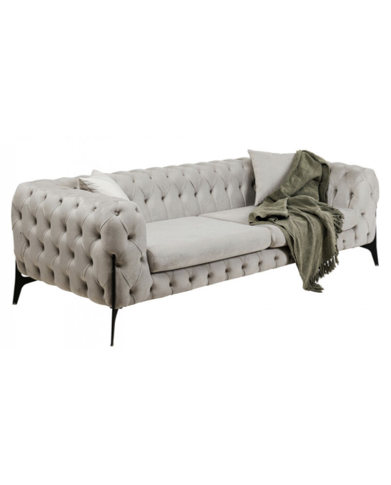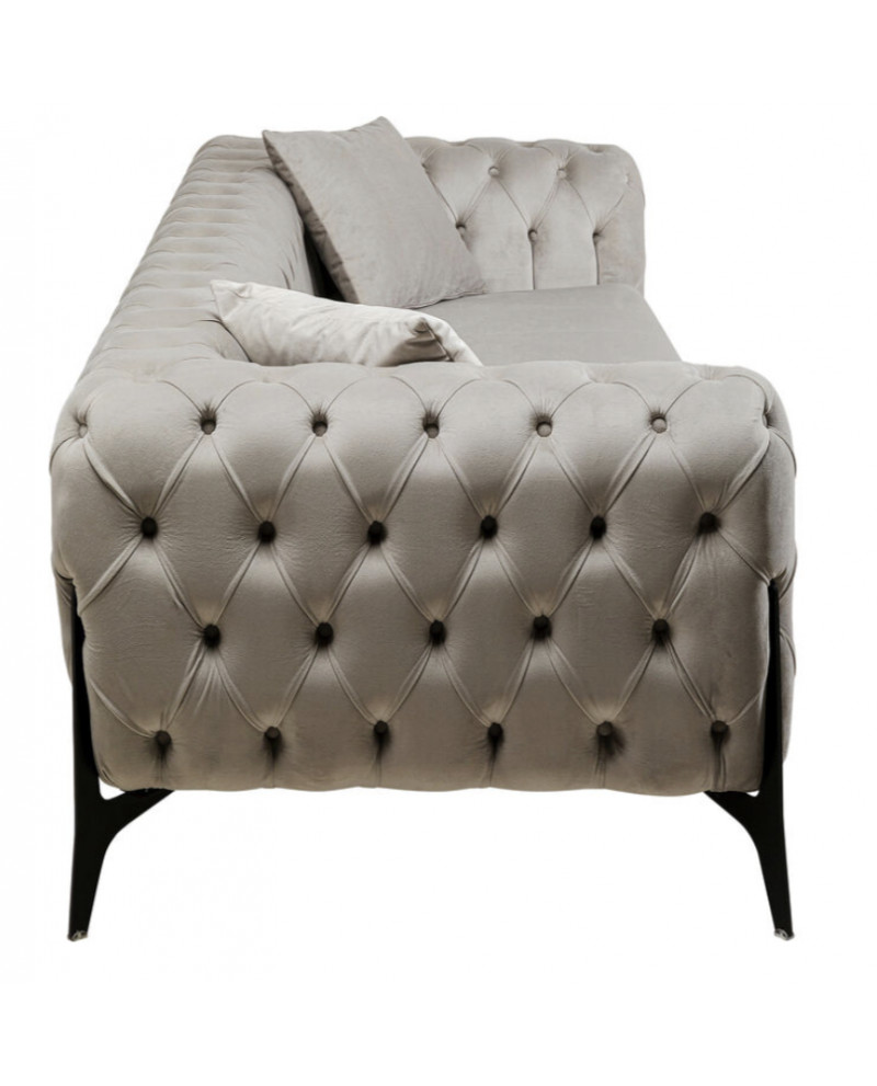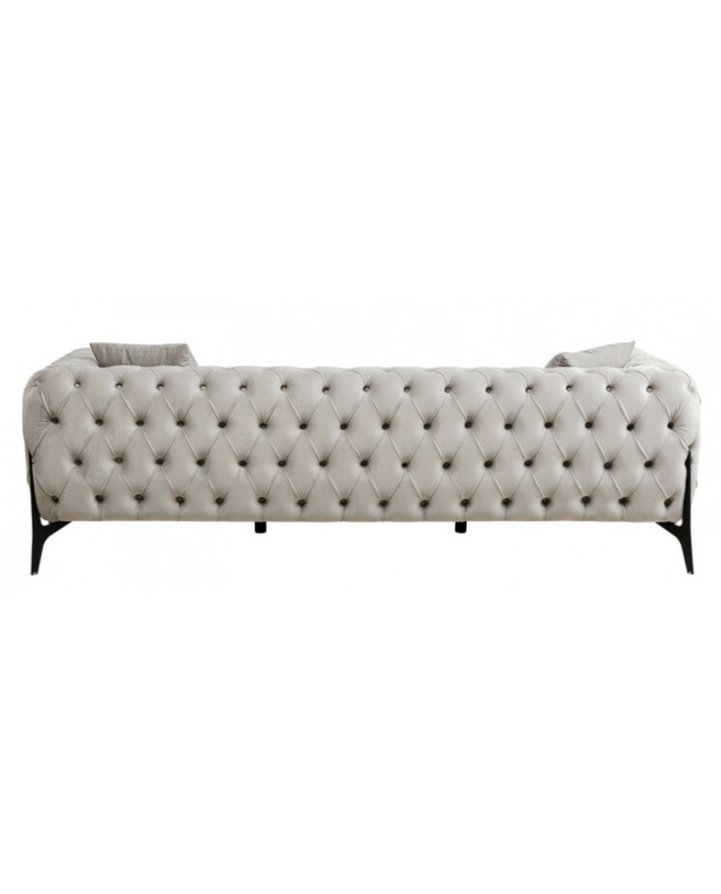 Le classique rencontre la modernité : des surpiqûres élégantes de style Chesterfield sur des pieds modernes en métal noir.