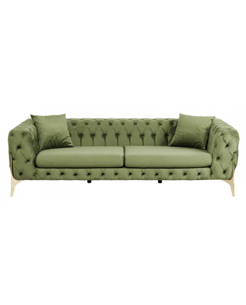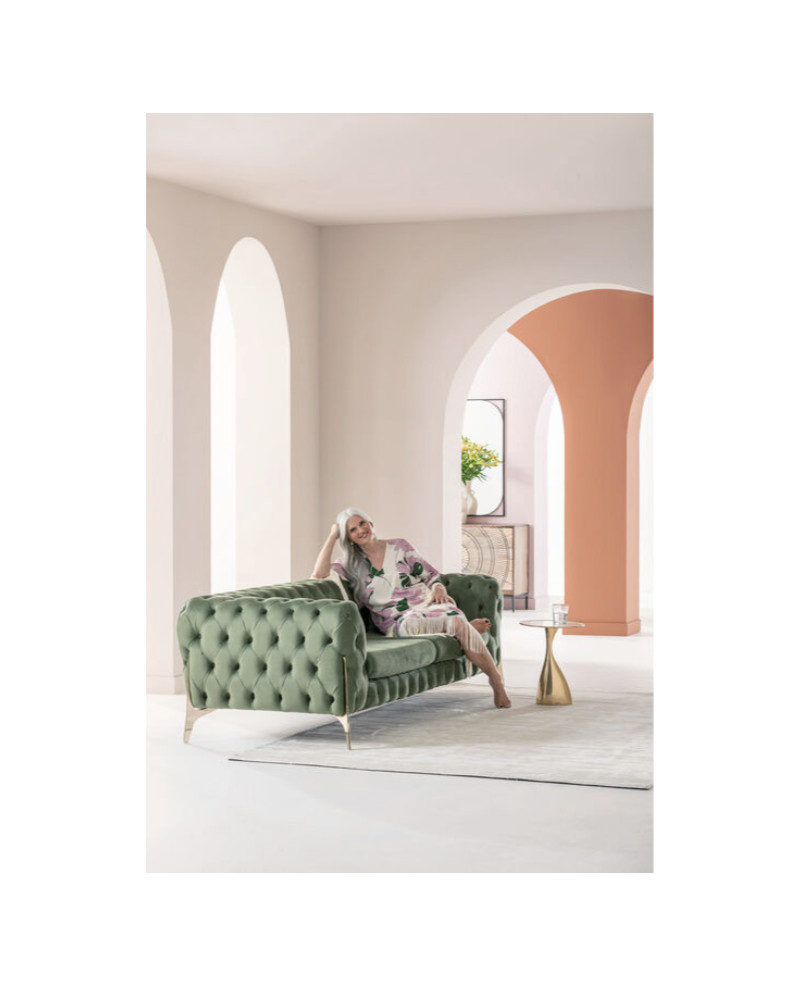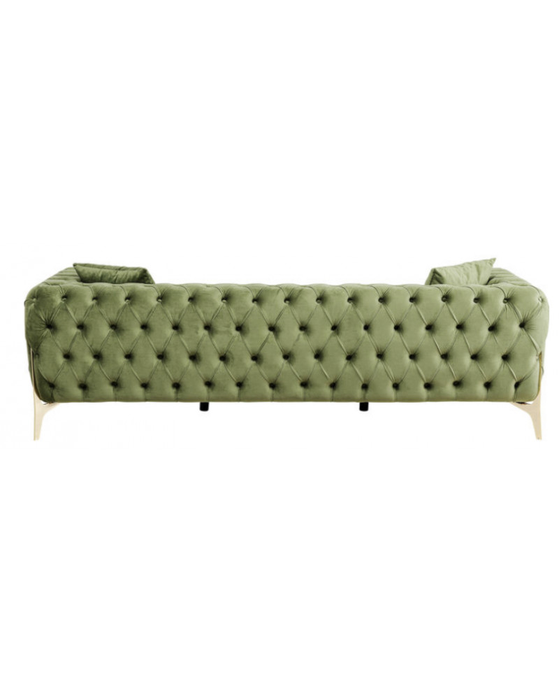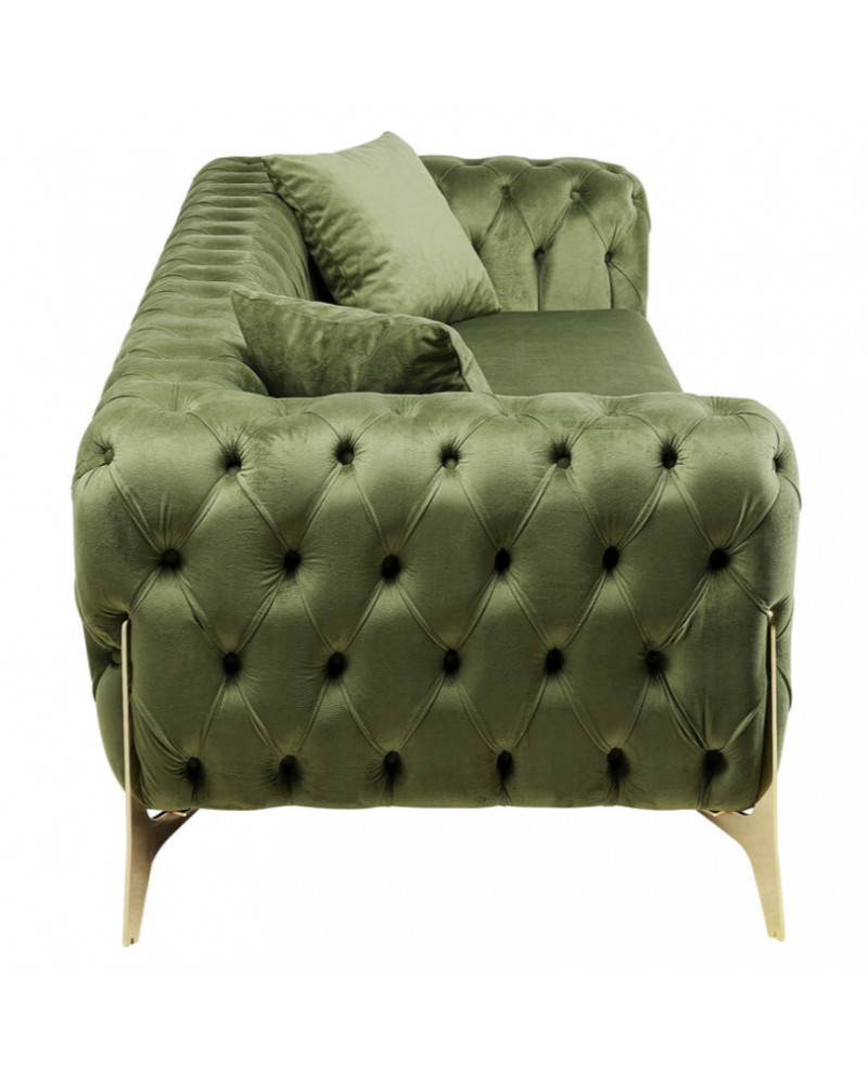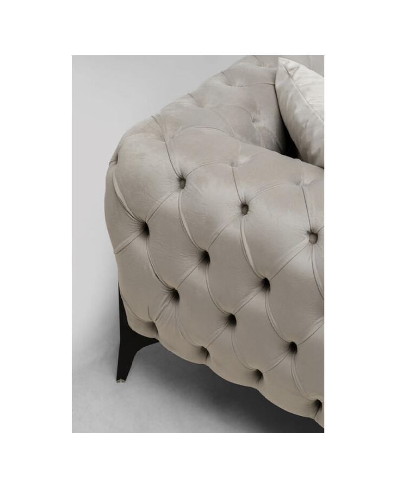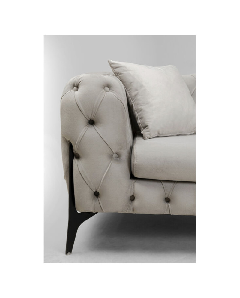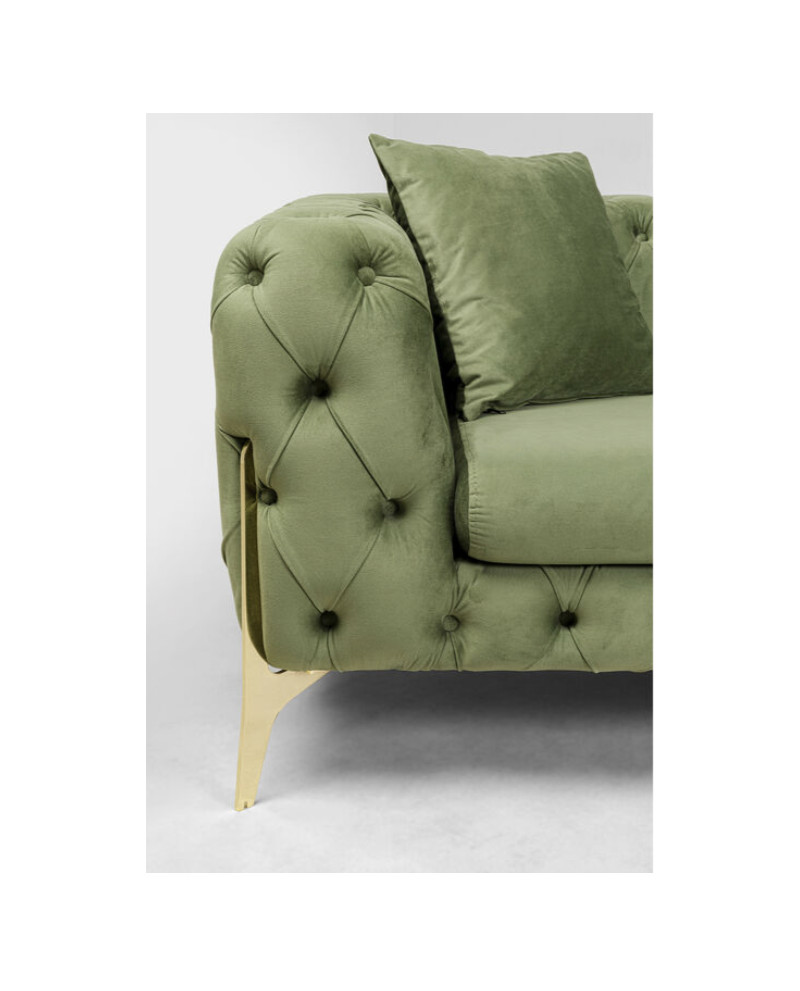 Son style Chesterfield et ses surpiqûres font de ce canapé en velours un classique. Sa particularité : les surpiqûres se prolongent également sur le dossier, alliant style et esthétique, et permettant de placer le canapé librement dans la pièce.