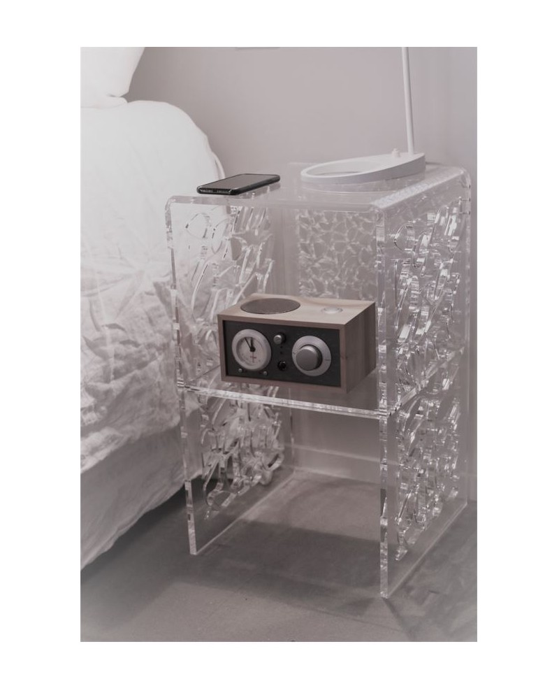 La ligne « Résille » de Clairline s’inspire des motifs d’architecture, transposition de la dentelle, qui magnifient les façades ajourées de certains bâtiments contemporains comme le MUCEM à Marseille par exemple. CLAIRLINE a décliné ce bel ornement sur une collection de meubles design en altuglas (PMMA) qui se démarquent par leur scintillement. Cette ligne est une véritable prouesse high-tech grâce à une découpe fine du PMMA (polyméthacrylate méthyle) au rayon laser. Tout en transparence, le mobilier en altuglas traverse les modes et les époques en se fondant dans toutes les décoration