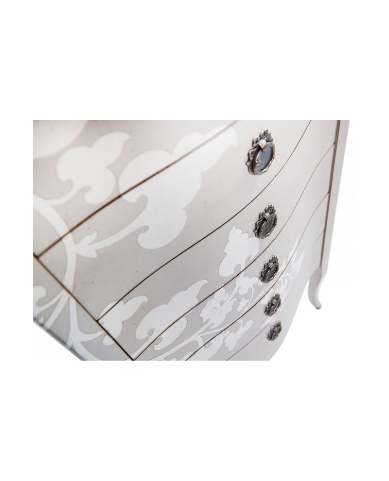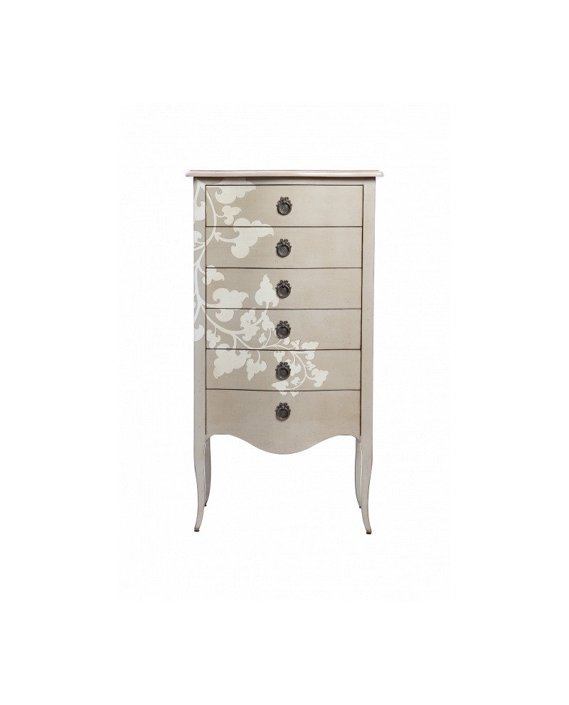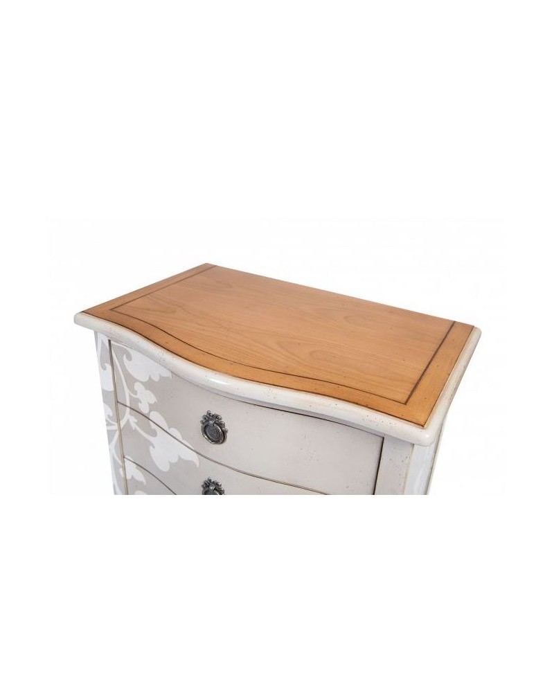 Chiffonnier galbée 6 tiroirs. Bois merisier massif et tilleul pour les parties laquées. Structure laquée vieux rose, plateau merisier délavé, tiroirs décor floral, patiné 1/2 antiquaire.