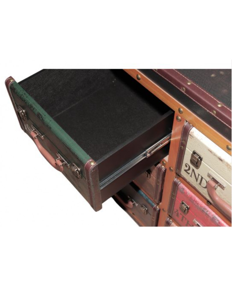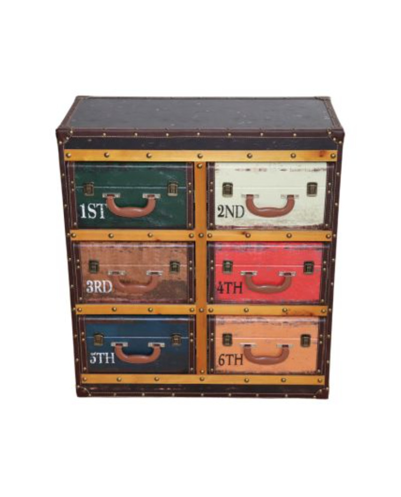 Plongez dans un voyage à travers les époques avec la collection MARCO et ses meubles imitation valise en cuire vintage. Ce style old school et rustique est à adopter pour un intérieur digne d'un explorateur. Ce meuble à 6 tiroirs colorés se place autant dans un salon, un bureau ou une chambre.