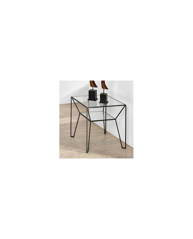 Bout de canapé épurée en métal gris anthracite, tablette en verre trempé.