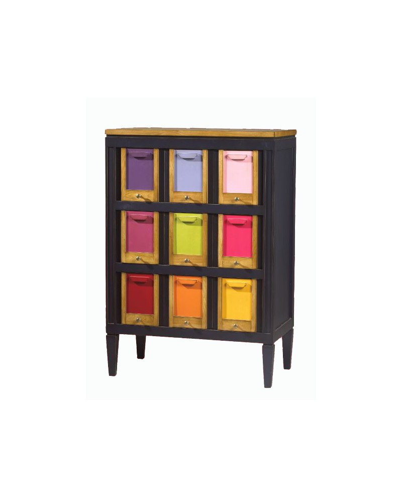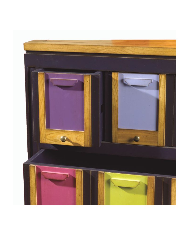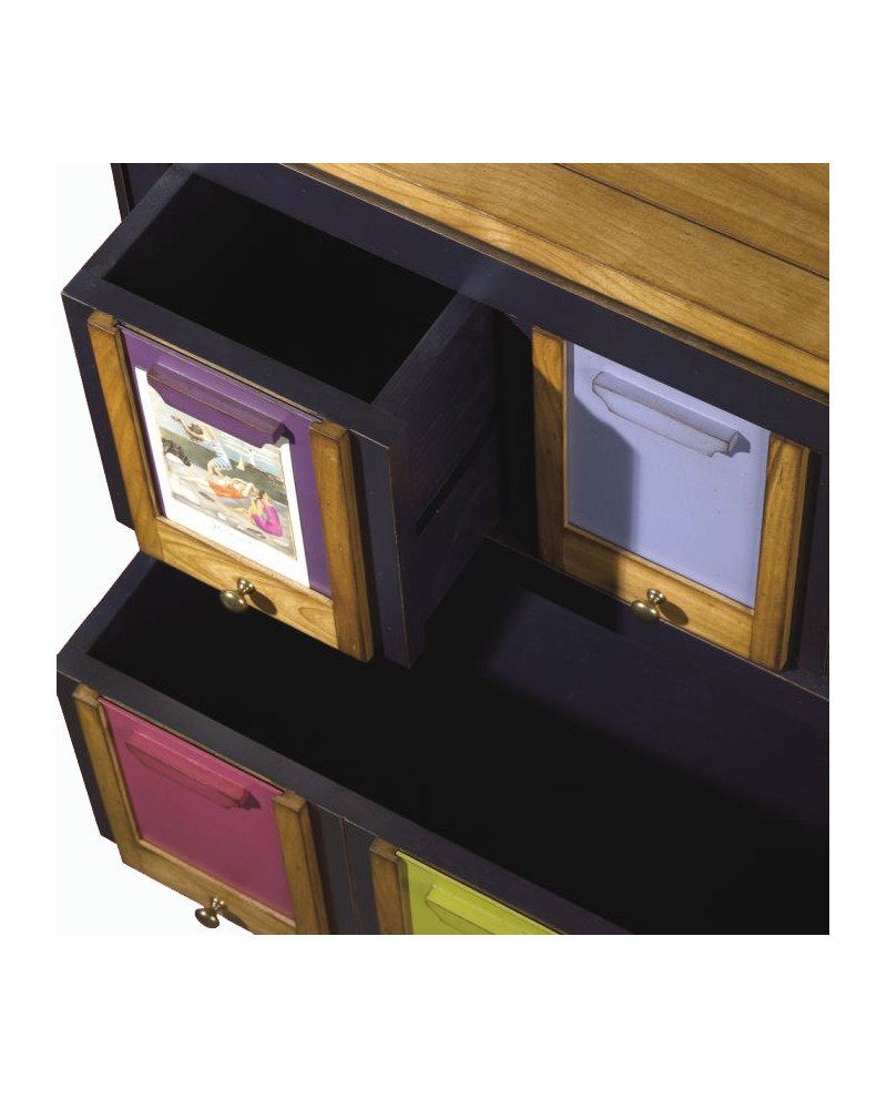 Commode 5 tiroirs (3 petits en haut + 2 grands en bas) bois merisier massif et hêtre. Structure laqué noir, décor portes photos laque multi-couleurs, plateau merisier délavé.
