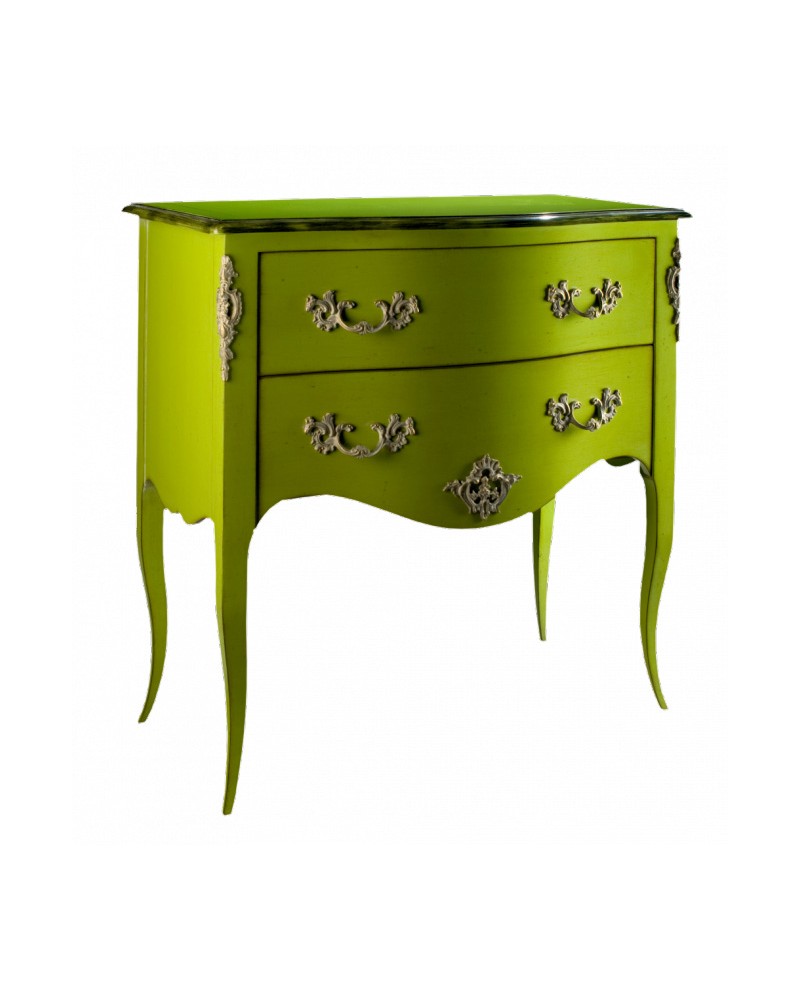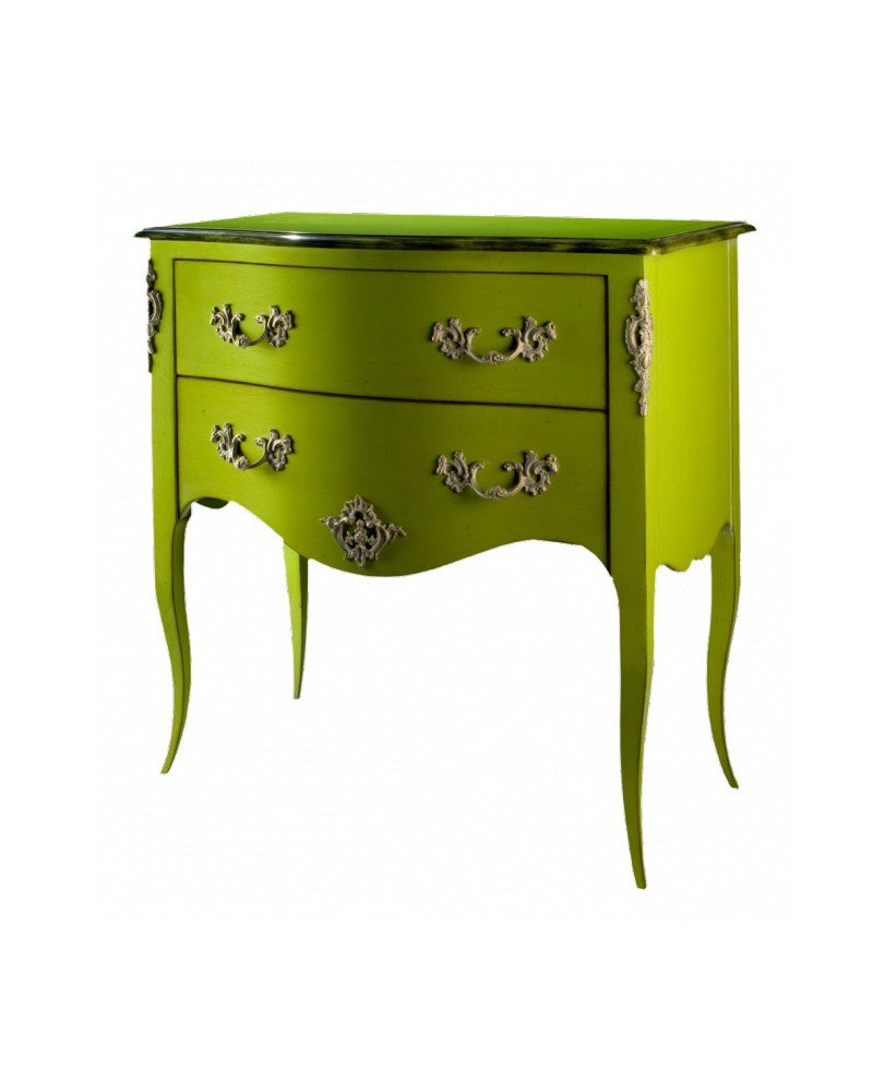 Commode galbée 2 tiroirs bois merisier massif et tilleul pour les parties laquées. Décor laque vert anis patiné 1/2 antiquaire.