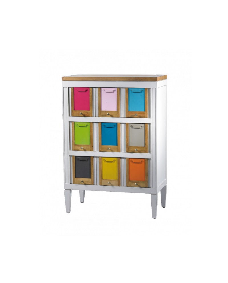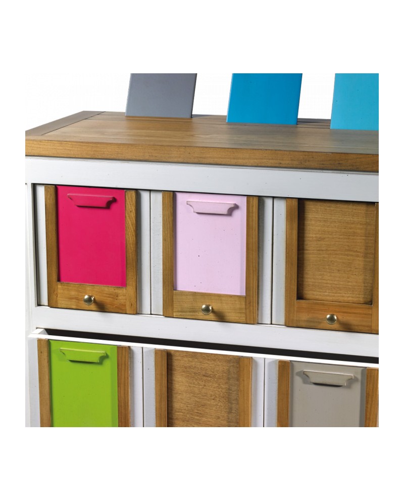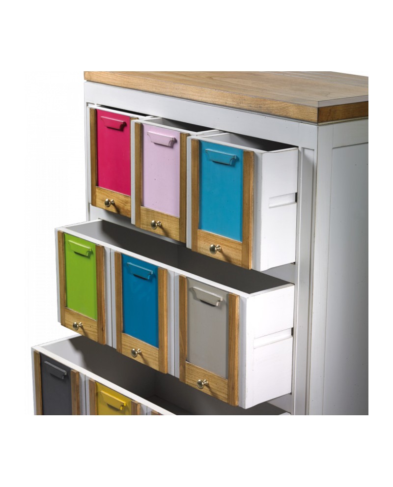Commode 5 tiroirs (3 petits en haut + 2 grands en bas) bois merisier massif et hêtre. Structure laqué blanc, décor portes photos laque multi-couleurs, plateau merisier délavé.