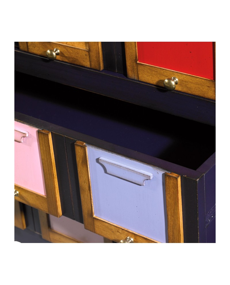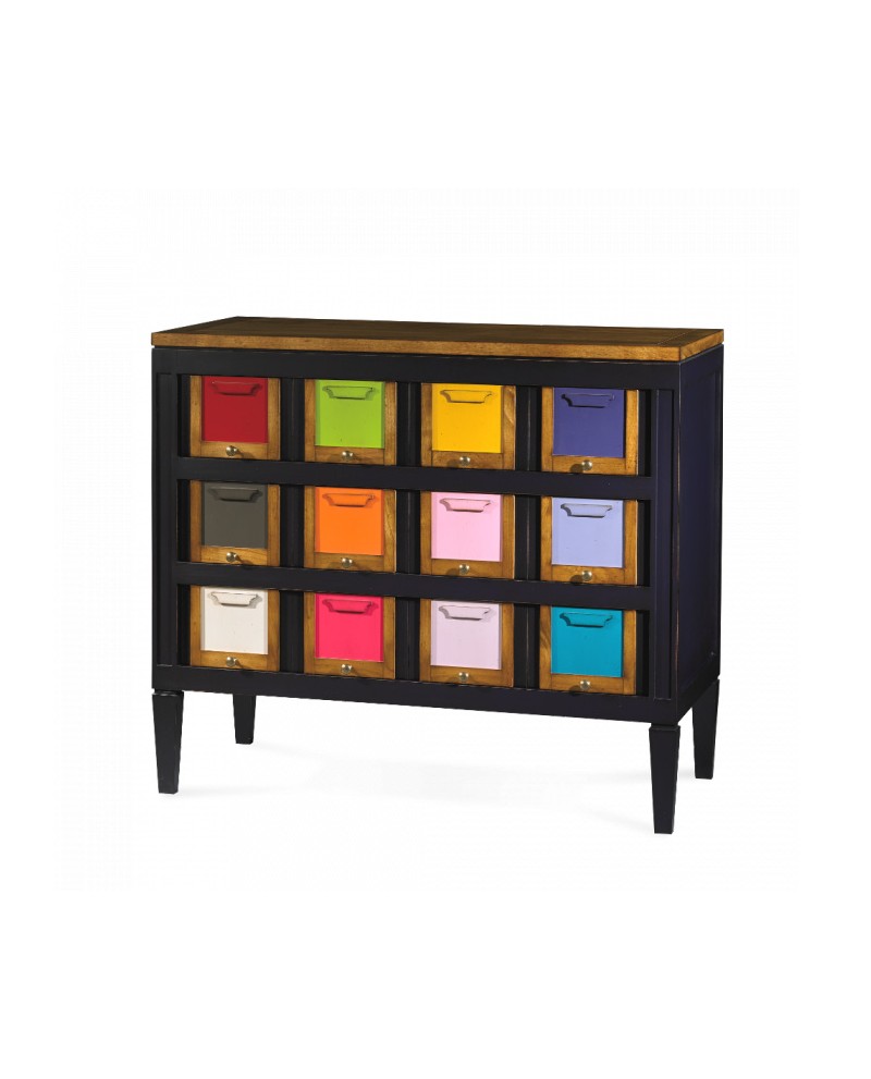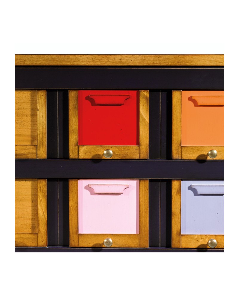 Commode 3 grands tiroirs, bois merisier massif et hêtre. Structure laqué noir, décor portes photos laque multi-couleurs, plateau merisier délavé.