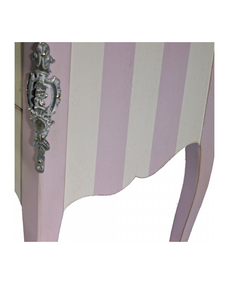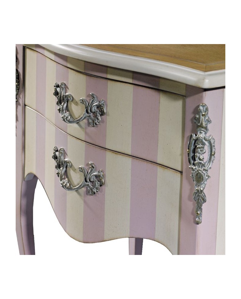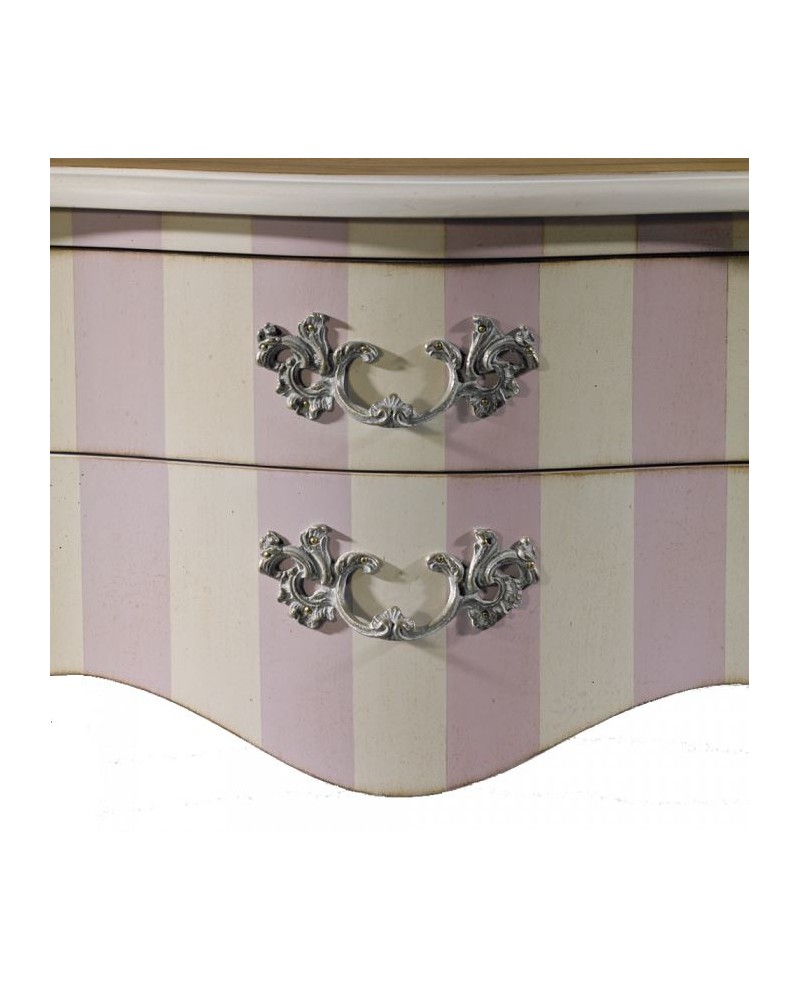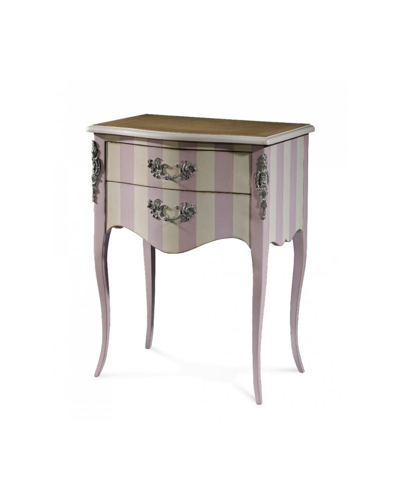 Mini commode 2 tiroirs. Bois merisier massif et tilleul pour les parties laquées. Plateau merisier délavé, décor laque rayures vieux rose et dune, patiné 1/2 antiquaire.