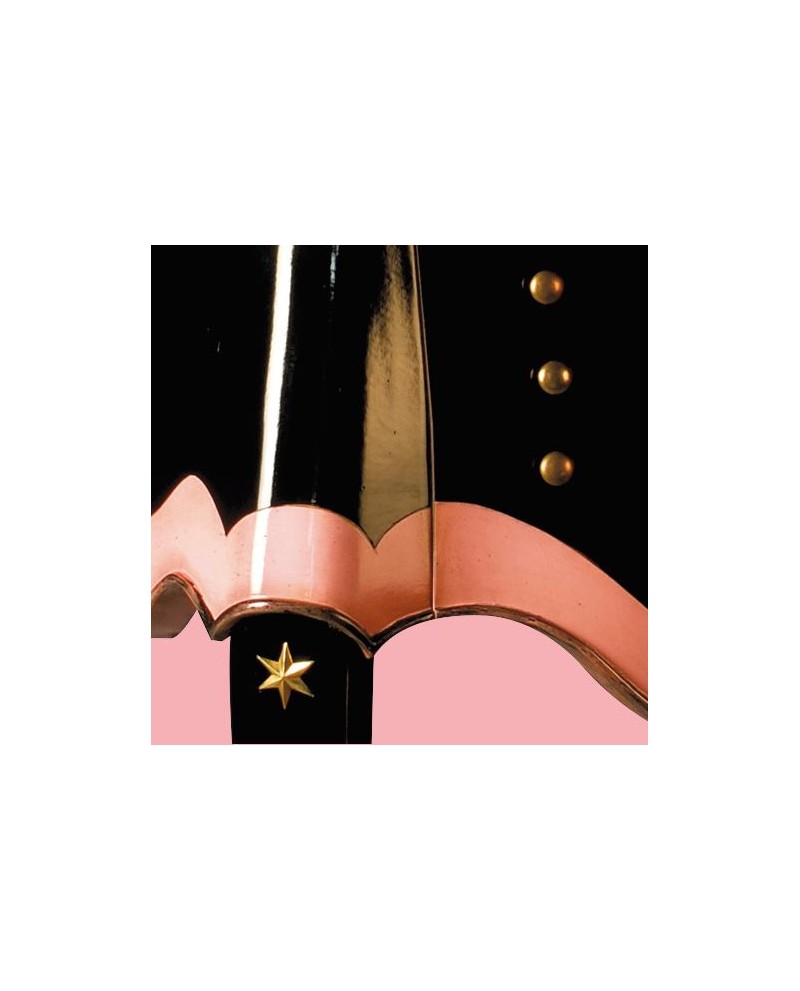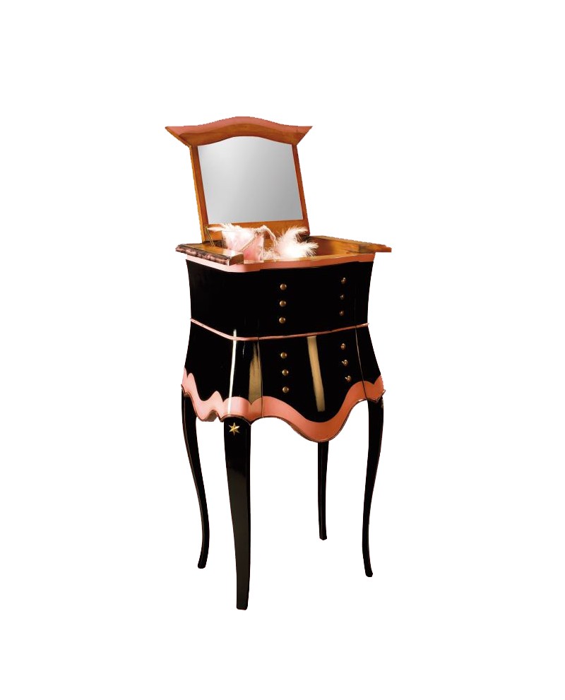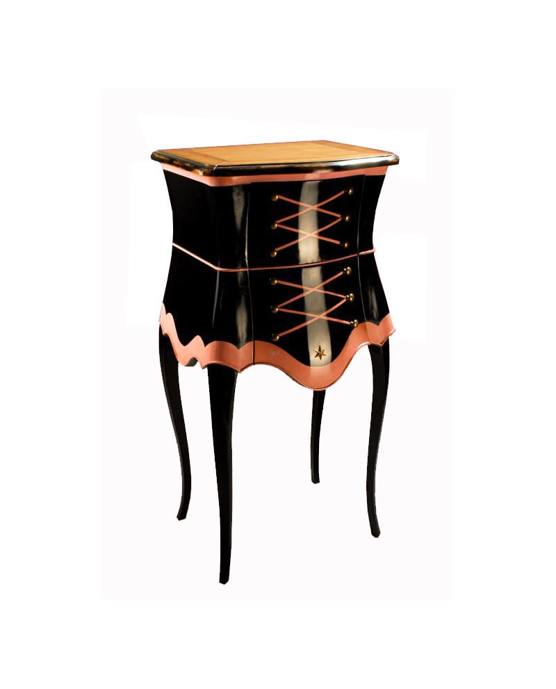 Petite commode galbée 2 tiroirs bois merisier massif. Plateau ouvrant avec un miroir, décor guêpière laquée noire lacets rose, finition 1/2 antiquaire.