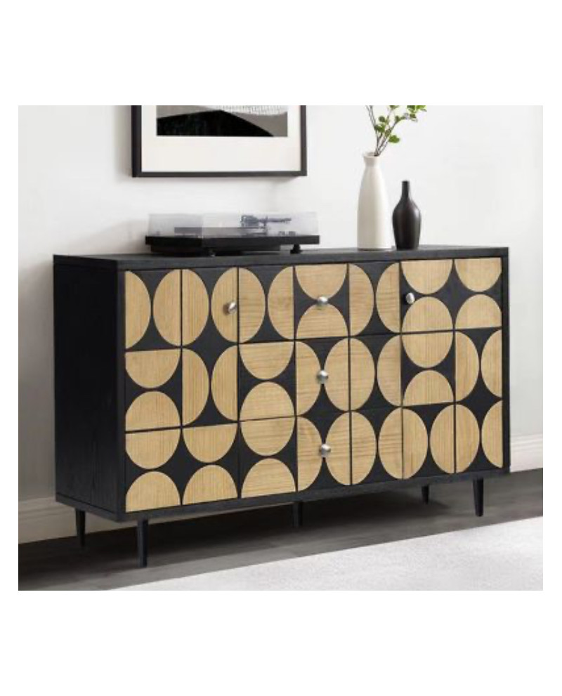 La collection BUBBLE est une série de meubles modernes au style 70'. Leur forme classique permet de les intégrer dans tout intérieur. Les motifs arrondis apportent une touche de fantaisie ce qui donne un caractère spécial et unique à ce meuble. Placé sur un mur coloré, il ressortira avec ses tons bois et noir. Cette commode peut prendre place dans une chambre afin de ranger des vêtements ou autres affaires dans ses grands tiroirs. Matière : médium de bois, pieds en métal.