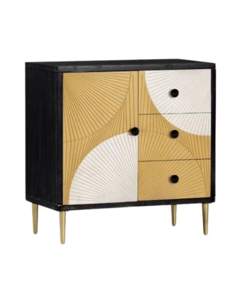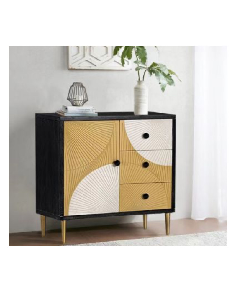 La collection MITRHA est une série de meubles aux tons chatoyants et lumineux. Les pieds dorés apportent de la légèreté au meuble et lui donnent un aspect prestigieux. Plongez-vous dans le décor pour observer un coucher de soleil. Ce meuble peut se placer dans une entrée ou dans un séjour afin de ranger les affaires du quotidien et de décorer et d'optimiser son intérieur. Matière : medium de bois et pin, pieds en métal.