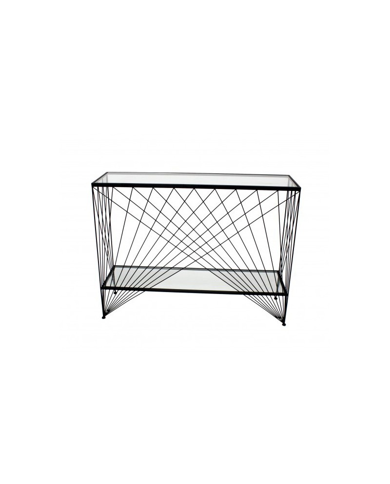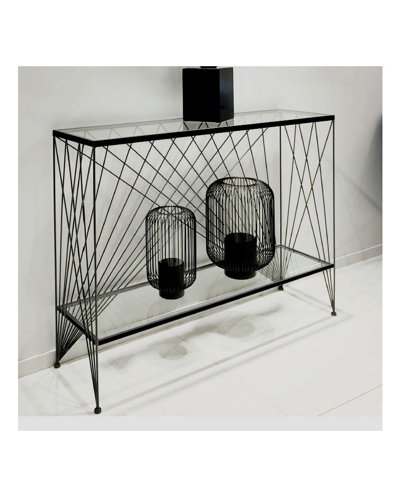 Console en métal noir filaire design géométrique, plateau verre transparent.
