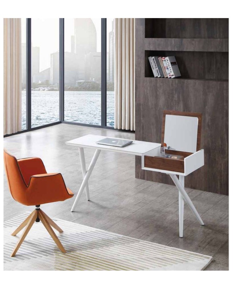 Console coiffeuse BEAUTY dessus en panneau de particules recouvert de céramique Arabescato 5.5 mm, rangement latéral en panneau de particules plaqué noyer avec un miroir.