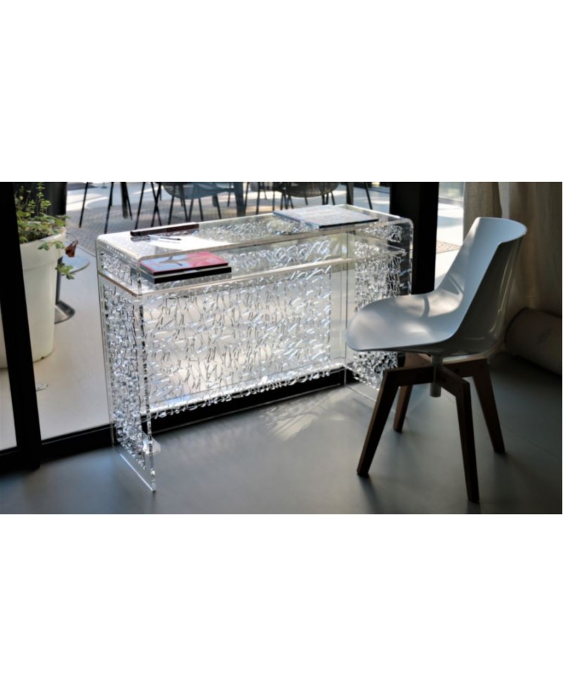 La ligne « Résille » de Clairline s’inspire des motifs d’architecture, transposition de la dentelle, qui magnifient les façades ajourées de certains bâtiments contemporains comme le MUCEM à Marseille par exemple. CLAIRLINE a décliné ce bel ornement sur une collection de meubles design en altuglas (PMMA) qui se démarquent par leur scintillement. Cette ligne est une véritable prouesse high-tech grâce à une découpe fine du PMMA (polyméthacrylate méthyle) au rayon laser. Tout en transparence, le mobilier en altuglas traverse les modes et les époques en se fondant dans toutes les décoration