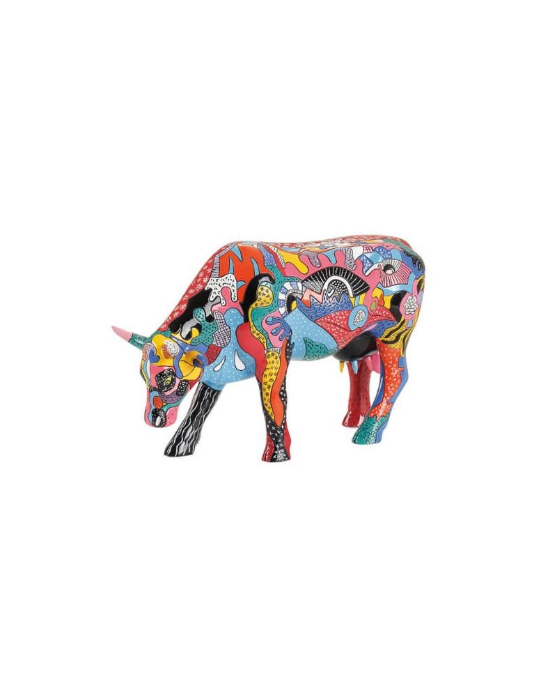 L'artiste, Allison Gregory, l'inspiration lors de la création de cette vache pour la CowParade à Austin Texas, USA 2011 était : Comment serait-ce si vous faisiez la fête avec Pablo Picasso ? Eh bien, le résultat, comme vous pouvez le voir, est un design amusant très coloré et des motifs mélangés ensemble. Créée par l'artiste Allison Gregory et présentée sur l'exposition de CowParade de Austin en 2011.
