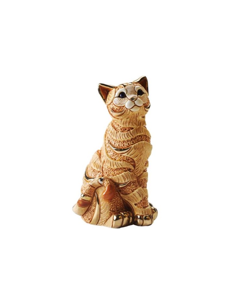 Statuette chat roux en céramique sculptée et peinte à la main, émail coloré, pulvérisation or 18 carats et de platine.