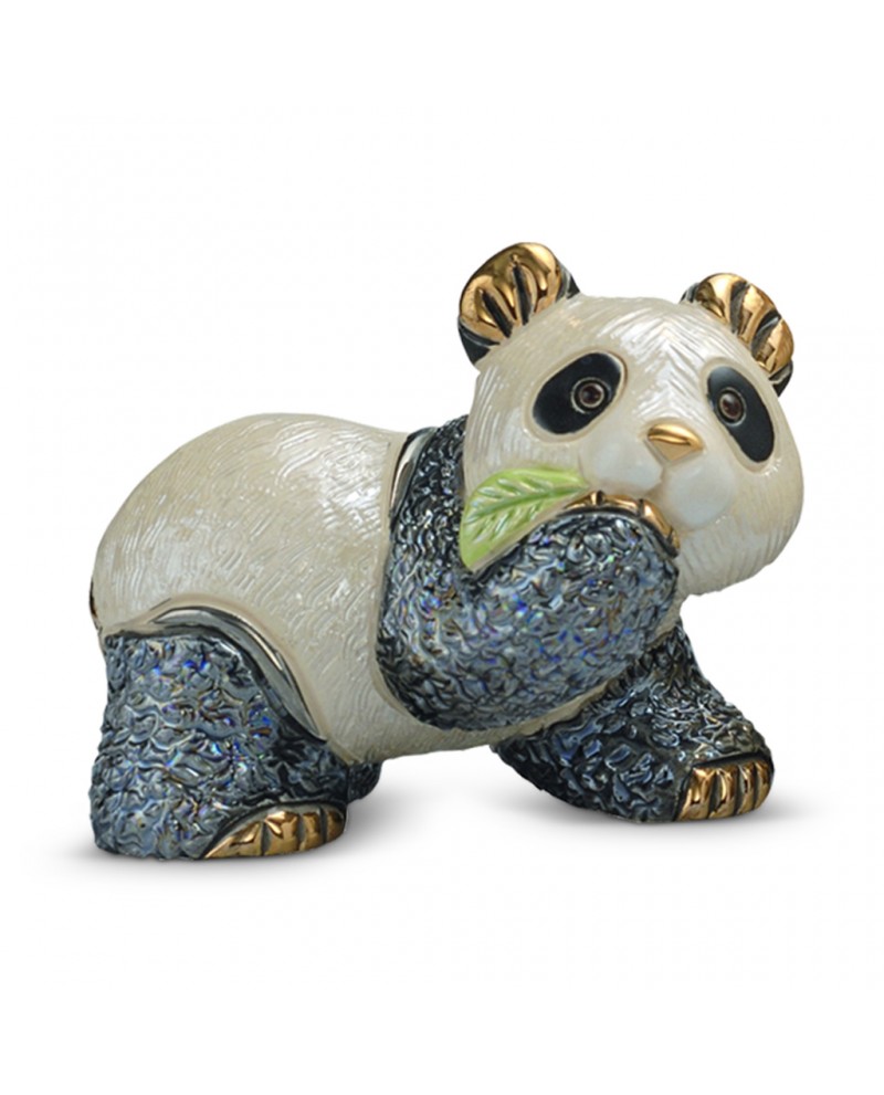 Statuette panda avec feuille en céramique sculptée et peint à la main, émail coloré, pulvérisation or 18 carats et de platine.