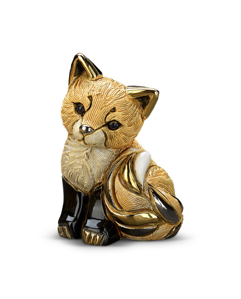 Statuette bébé renard roux en céramique sculptée et peint à la main, émail coloré, pulvérisation or 18 carats et de platine.