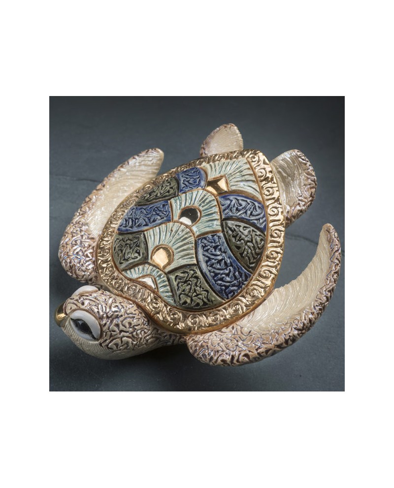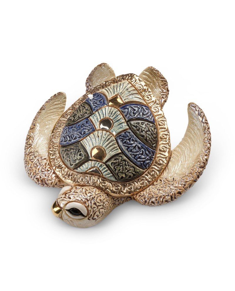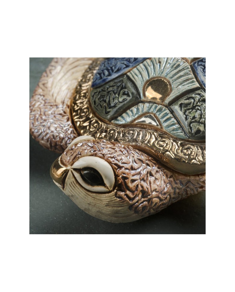Statuette Tortue de mer en céramique sculptée et peinte à la main, émail coloré, pulvérisation or 18 carats et de platine.