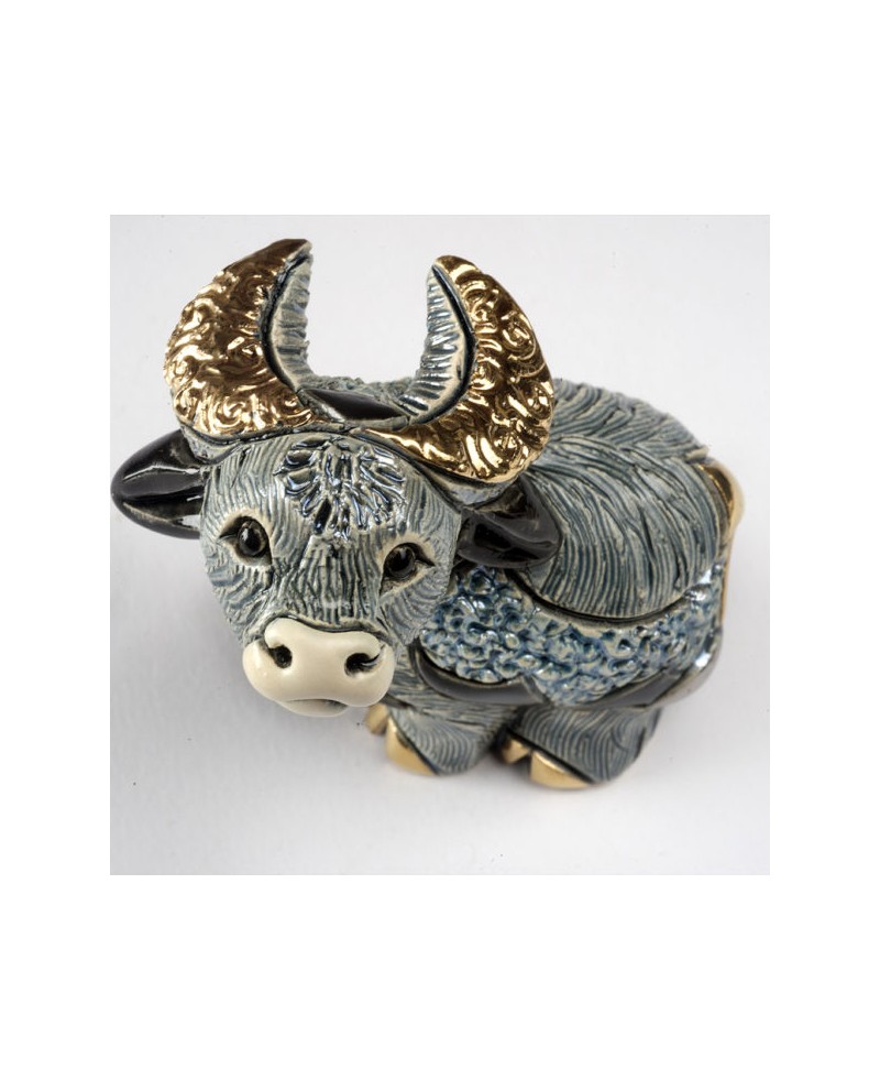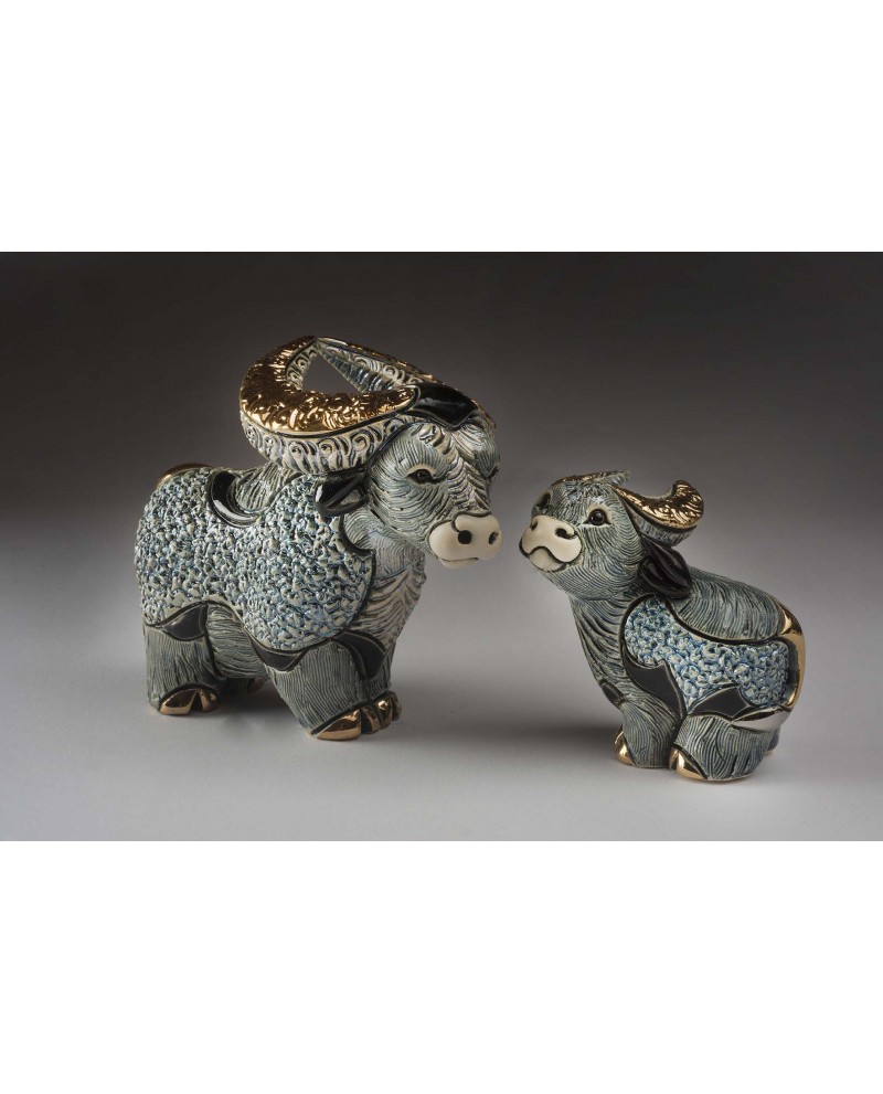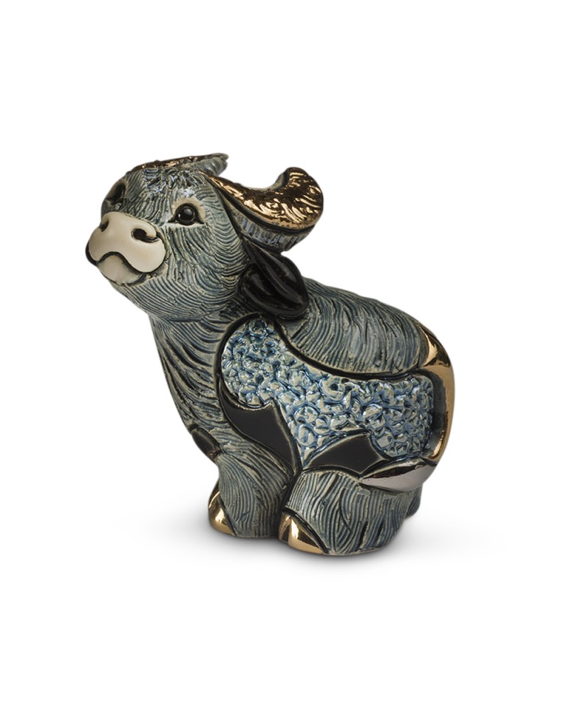 Statuette bébé Buffle bleu en céramique sculptée et peinte à la main, émail coloré, pulvérisation or 18 carats et de platine.