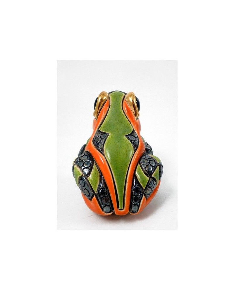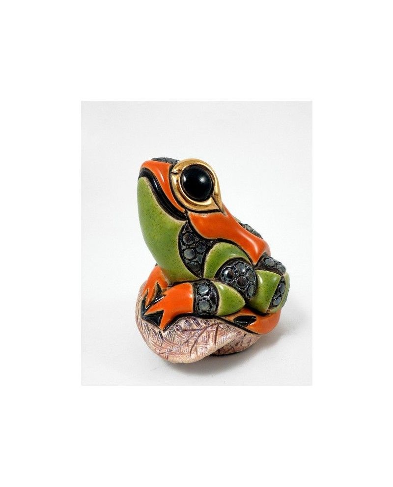 Statuette Grenouille sur une feuille en céramique sculptée et peinte à la main, émail coloré, pulvérisation or 18 carats et de platine.