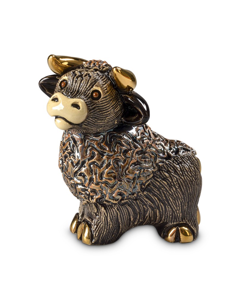 Statuette d'un mini Taureau en céramique, sculptée et peinte à la main, émail coloré, pulvérisation or 18 carats et de platine.