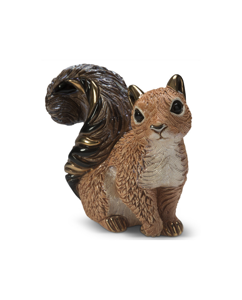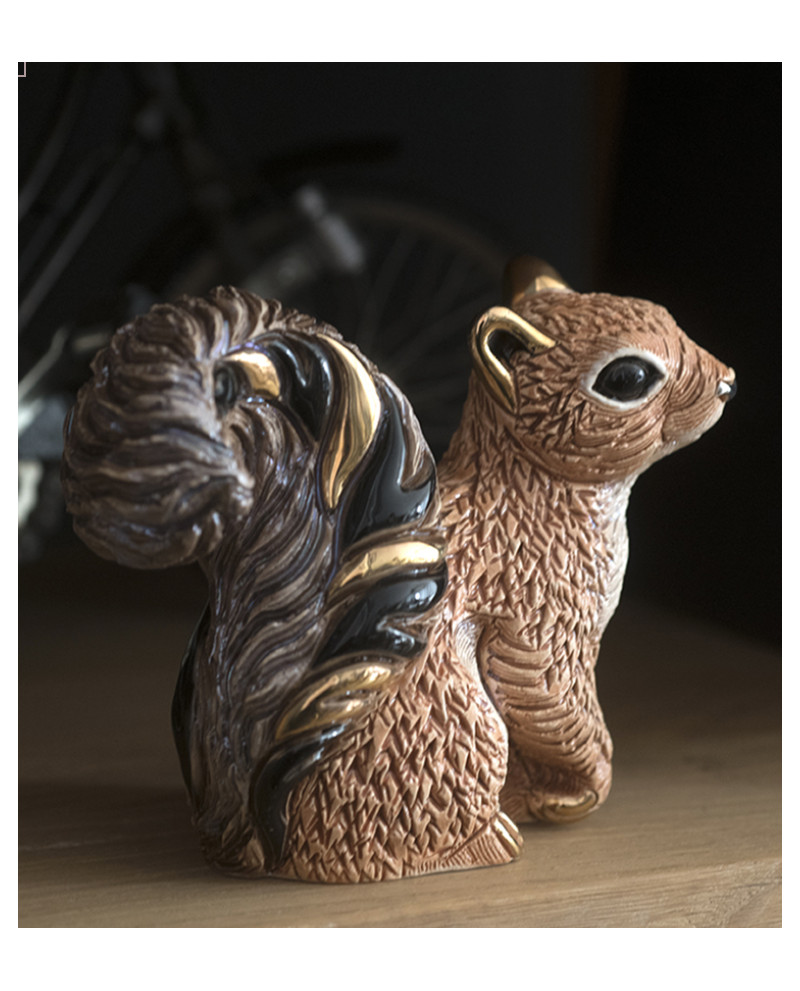 Statuette Écureuil en céramique sculptée et peinte à la main, émail coloré, pulvérisation or 18 carats et de platine.
