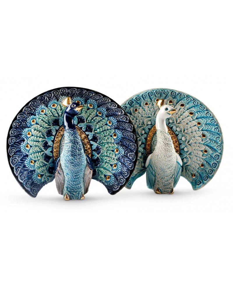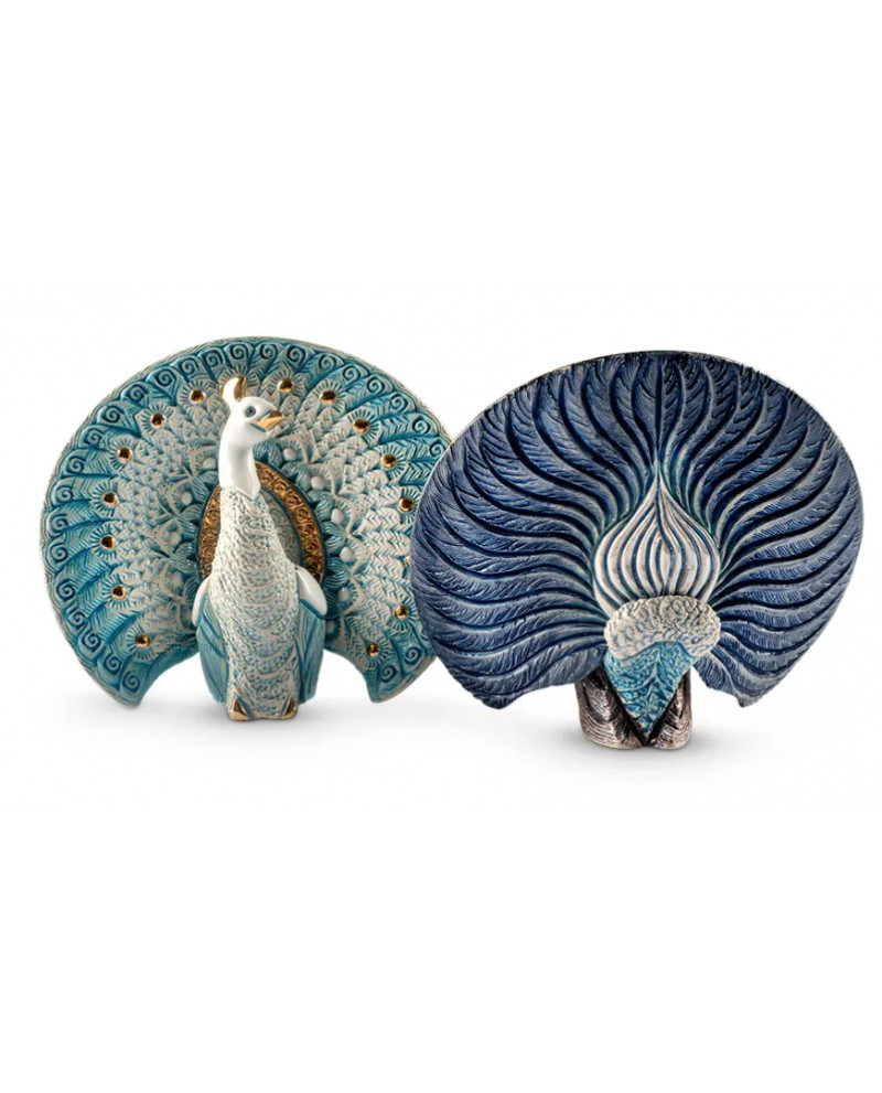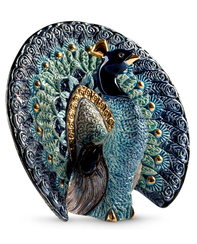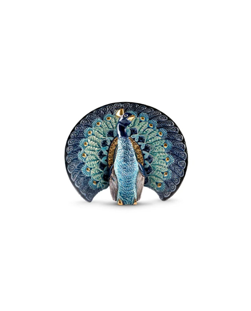 Statuette de paon en céramique sculptée et peint à la main, émail coloré, pulvérisation or 18 carats et de platine.