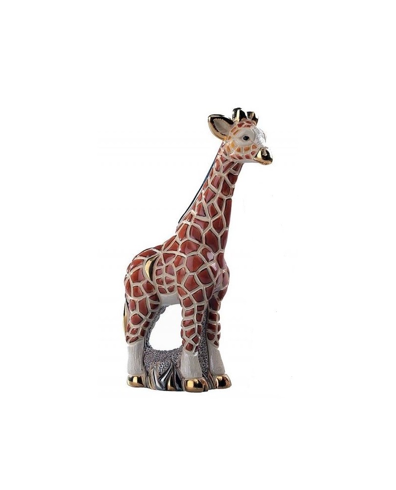 Statuette girafe en céramique sculptée et peint à la main, émail coloré, pulvérisation or 18 carats et de platine.