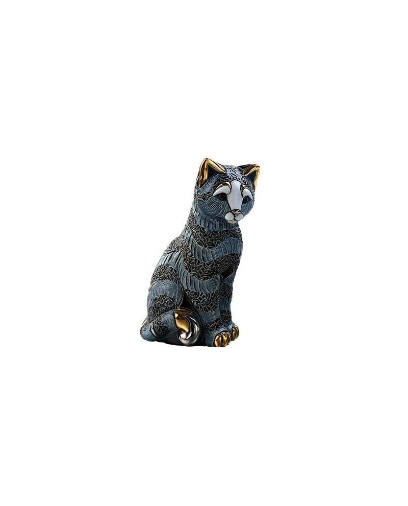 Statuette chat rayé en céramique sculptée et peint à la main, émail coloré, pulvérisation or 18 carats et de platine.